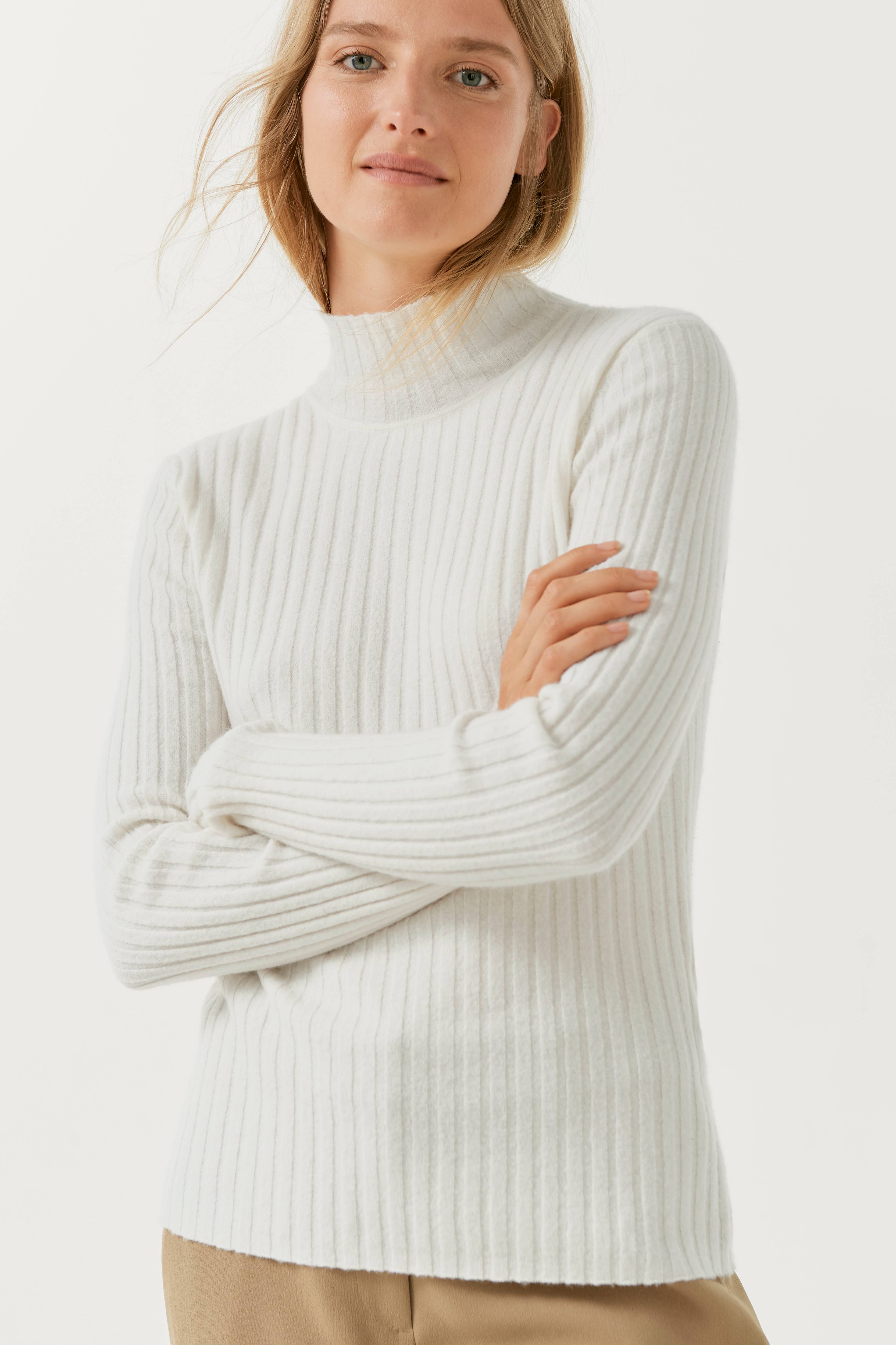 Pologenser Moscow fra Stylein X Isabella i myk, ribbestrikket kvalitet av blant annet merinoull og kasjmir. Figurnær modell med halvpolokrage.