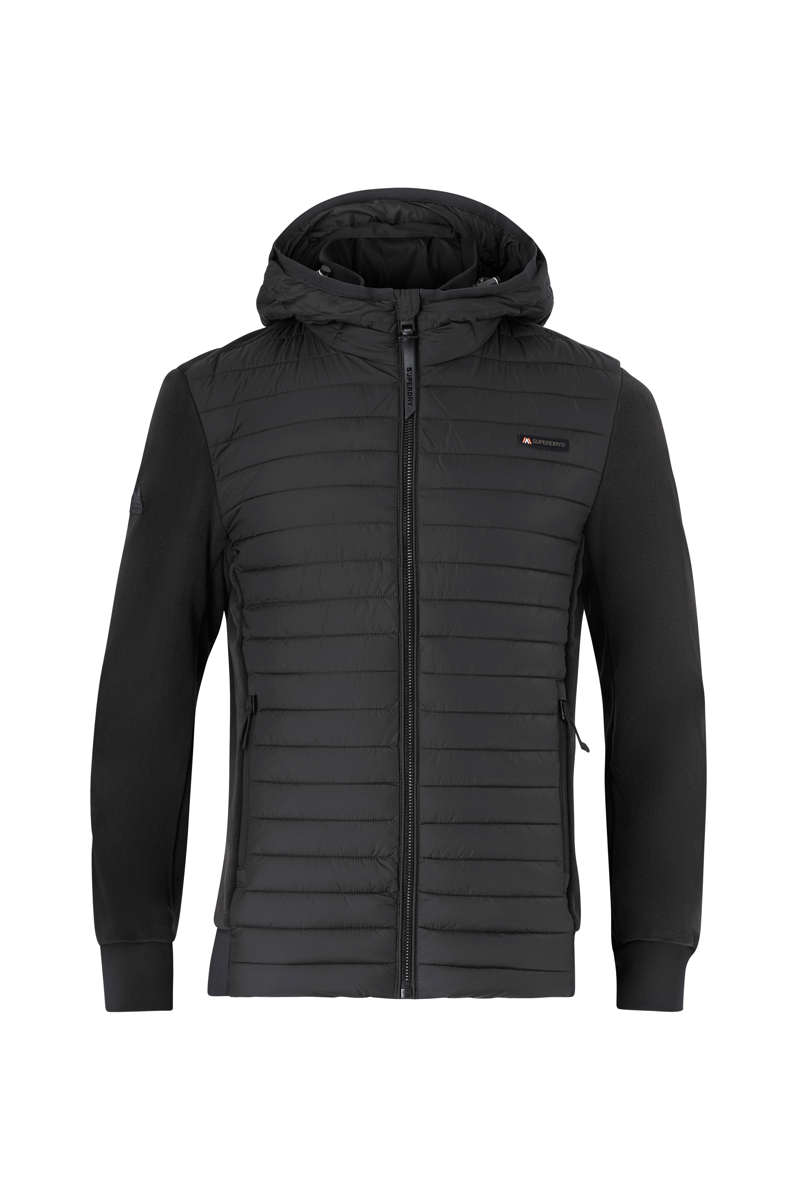 • Jakke med delvis fleecestoff • Vattert frontpanel med glidelås og høy hals • Fast, justerbar hette • Glidelåslommer foran • Ribbet mansjetter i ermeslutten • Fleece-foret innside • En åpen innerlomme • Ribbet hem bakpå • Lengde: 69 cm i størrelse M