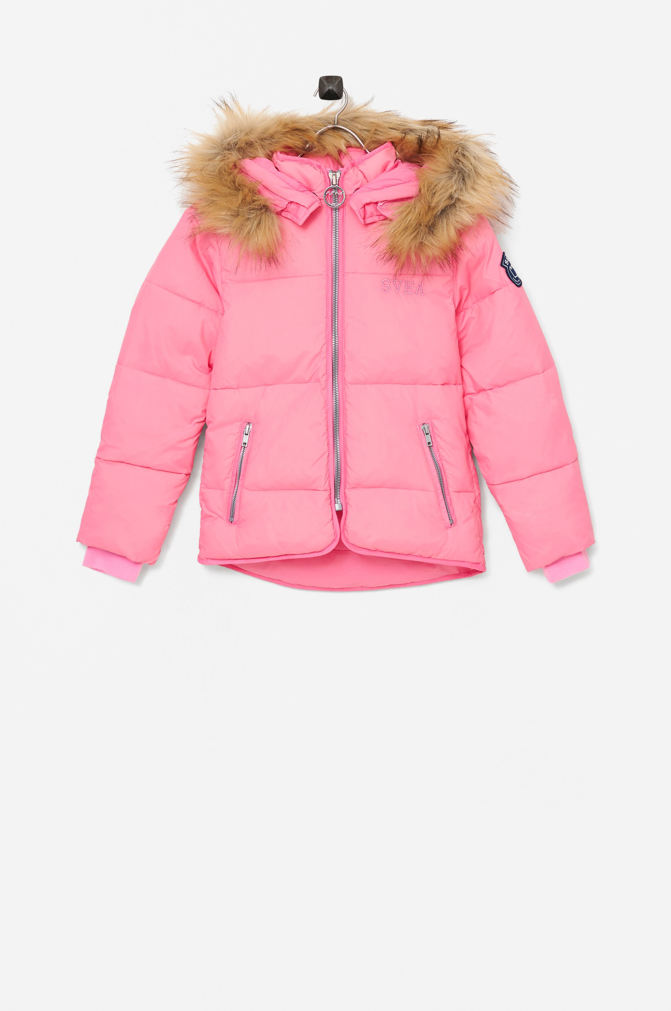 Jakke K. Short Slim Jacket fra Svea med varm vattering og avtakbar hette med avtakbar fuskepelskant. Glidelås og to glidelåslommer foran. Vrangbord i ermekantene.