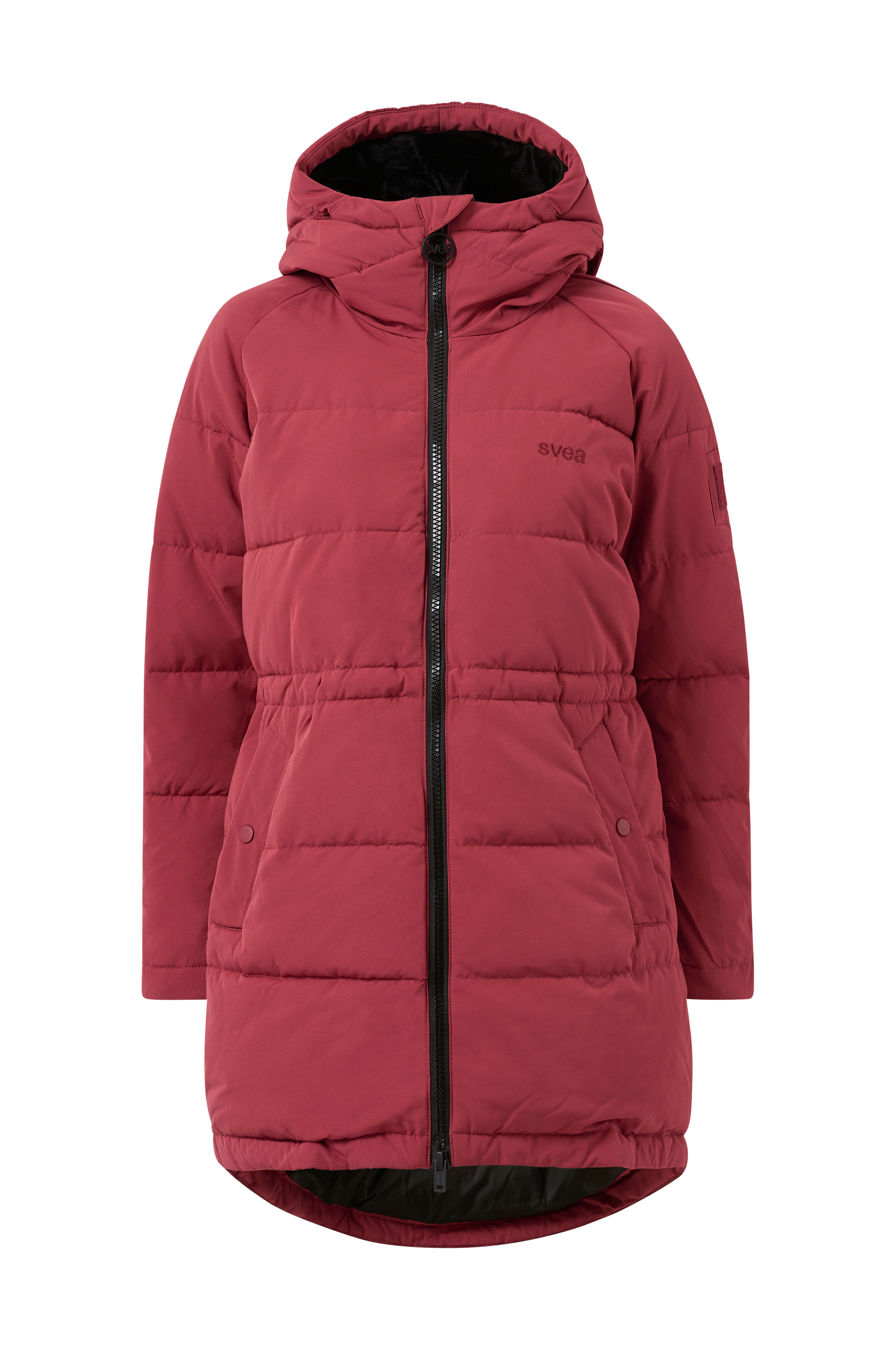Jakke W. Hourglass Puffer Jacket fra Svea med feminin passform som kan justeres innvendig i midjen. Vattert modell med mykt velurfôr øverst. Toveisglidelås og to fleecefôrede lommer foran. Fast hette med snøring og mykt fôr. Jakken er lengre bak. Lengde foran ca. 80 cm i str S.