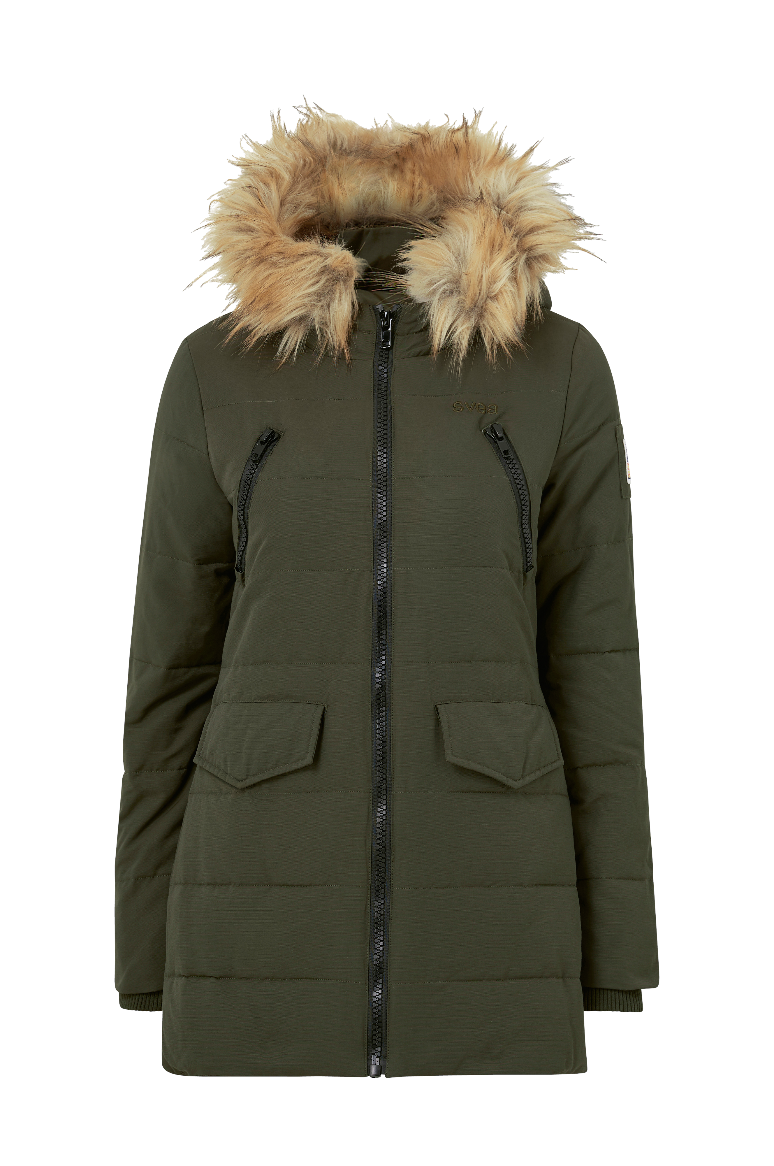 Jakke W. Joy Jacket fra Svea i slitesterk nylon- og bomullsblanding med varmende vattering. Mellomlang modell med glidelås og fire fleecefôrede lommer foran, vrangbord i ermekant og justerbar midje med innvendig snøring. Fast hette med avtagbar fuskepelskant. Lengde ca. 78 cm i str S.