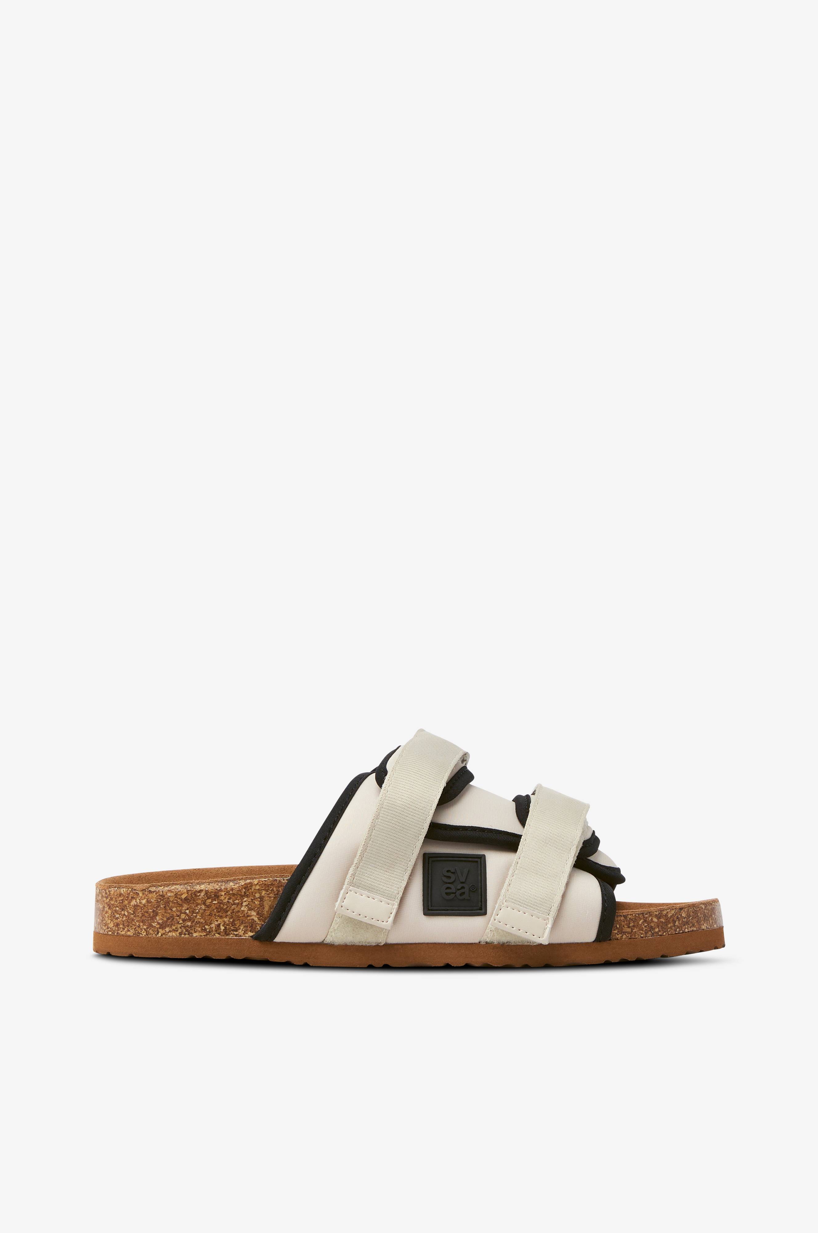 Fotformet modell med skålet såle i kork som har innersåle i semsket imitasjon. Overdel i vattert neopren med lange borrelåsremmer. Mønstret yttersåle.