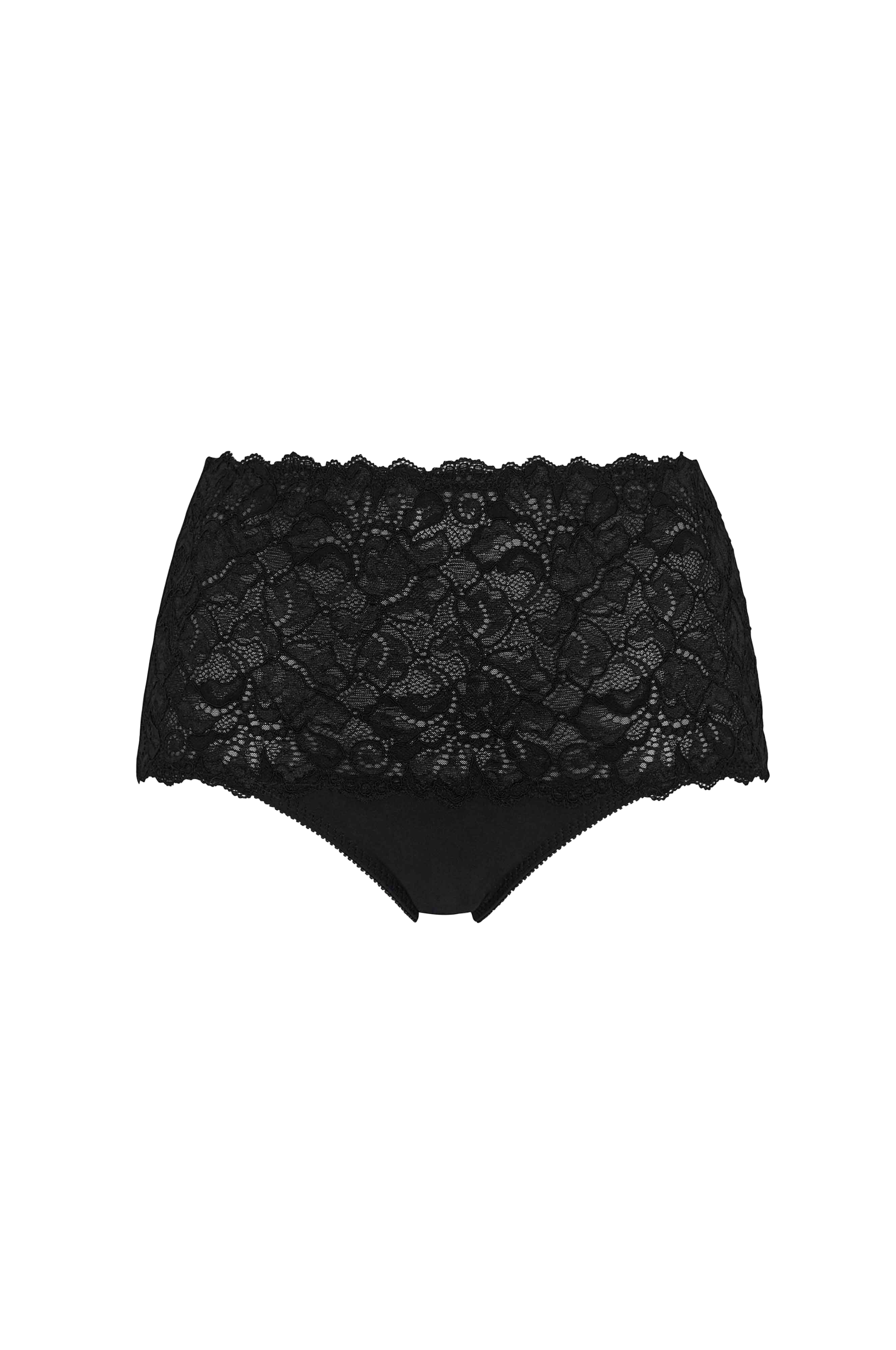 Den støttende maxitrusen kombinerer eleganse og funksjonalitet med sine vakre blondedetaljer og formende effekt. Fronten er prydet med brede blonder og foret med et lett støttende materiale som gir en skånsom formende effekt og en glatt silhuett. De lavt skårne benåpningene gir en sikker og behagelig passform, selv under aktivitet, mens den myke strikken rundt benåpningene sørger for at trusen holder seg komfortabel hele dagen. Baksiden av trusen er glatt for ekstra komfort.