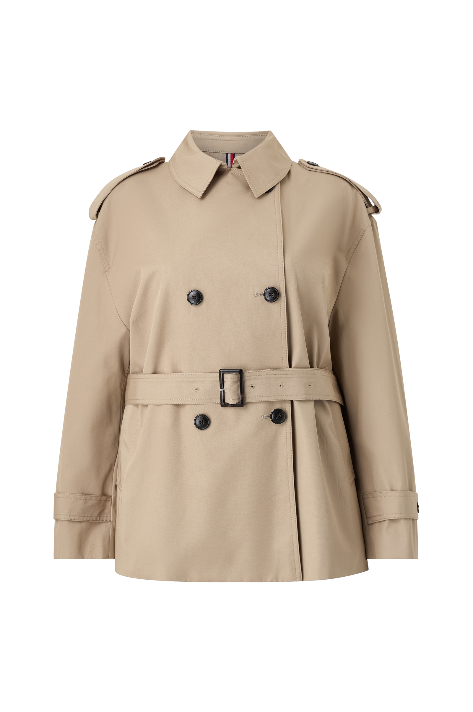 • Kort trenchcoat• Klassisk modell• Lukking med doble knapper• Sidelommer• Knytbart belte• Løssittende bærestykke• Vevd, stripete foring• Lengde: 75 cm i størrelse 48• Pluss-størrelser