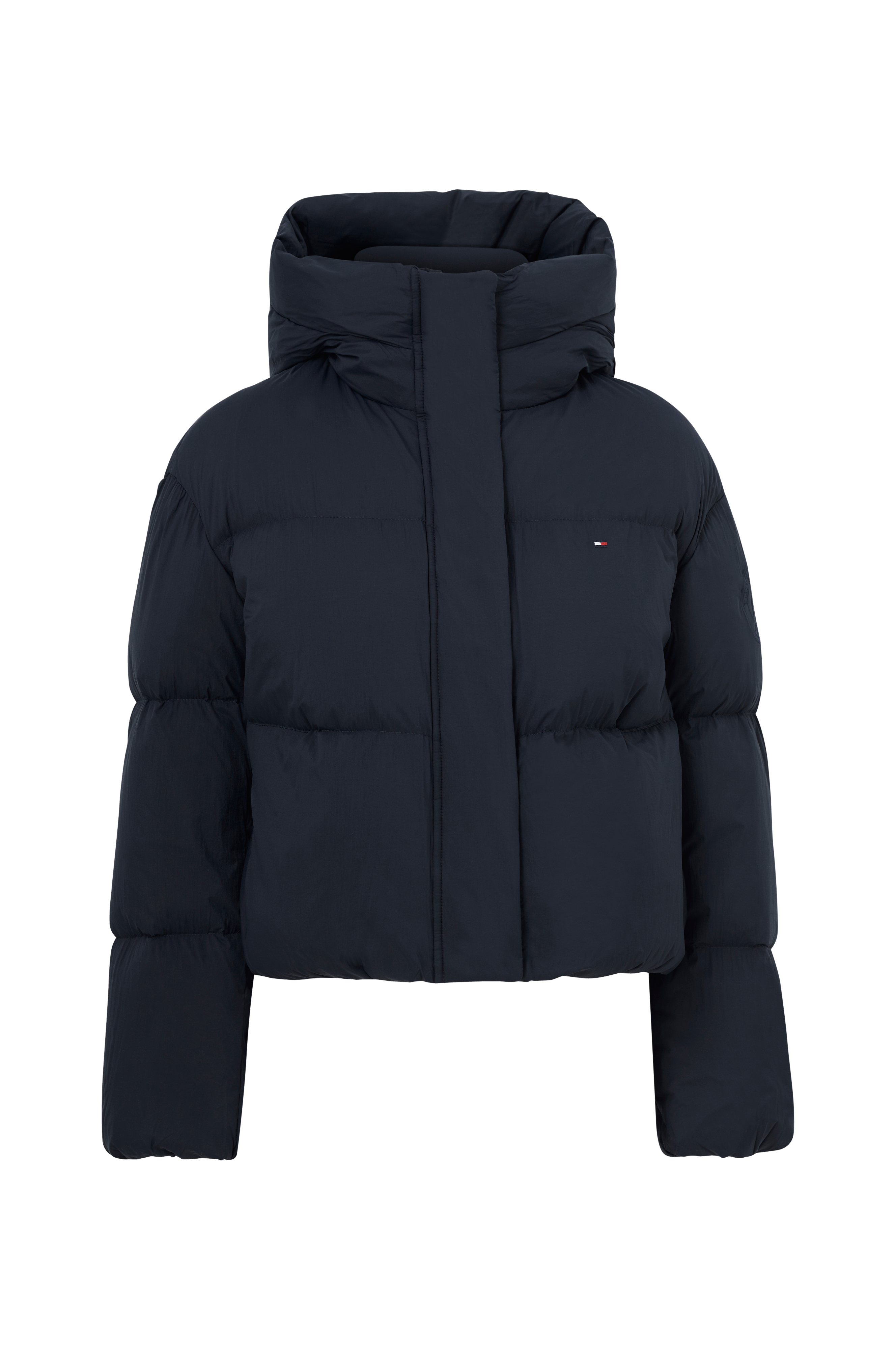 Dunjakke med myk, vannavvisende overflate og varm isolering av 90% fjær og 10% dun. Avslappet passform. Fast hette, glidelås og vindstolpe med trykknapper. To lommer med glidelås. Strikk i erme- og nederkant. Lengde ca. 61 cm i str S.