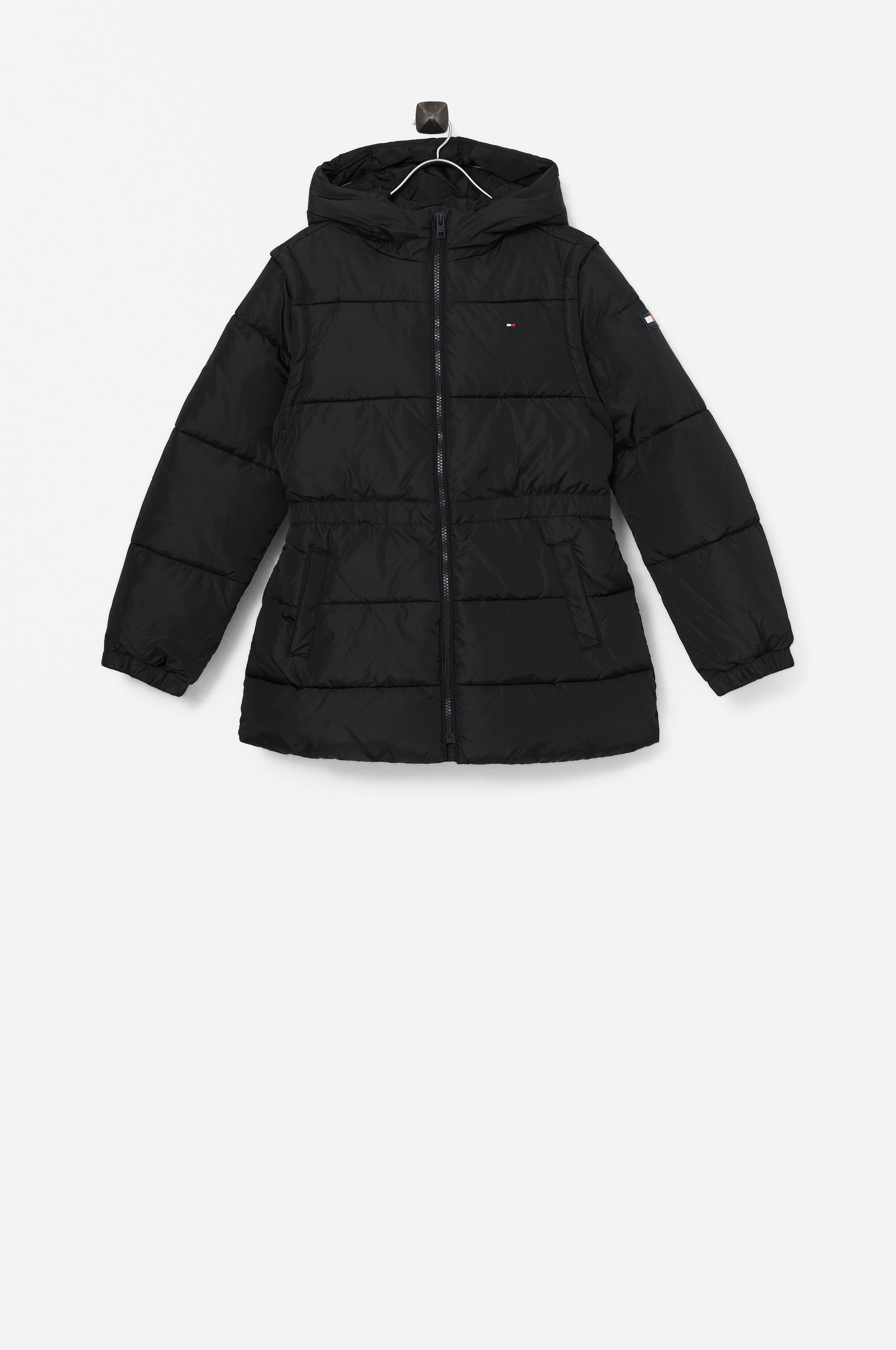Quiltet og vattert jakke med vannavvisende overflate. Ermene er avtagbare med glidelås slik at jakken også kan bli en vest. Fast hette, høy krage og lukking med glidelås. To lommer med trykknapper. Strikk i ermekantene
