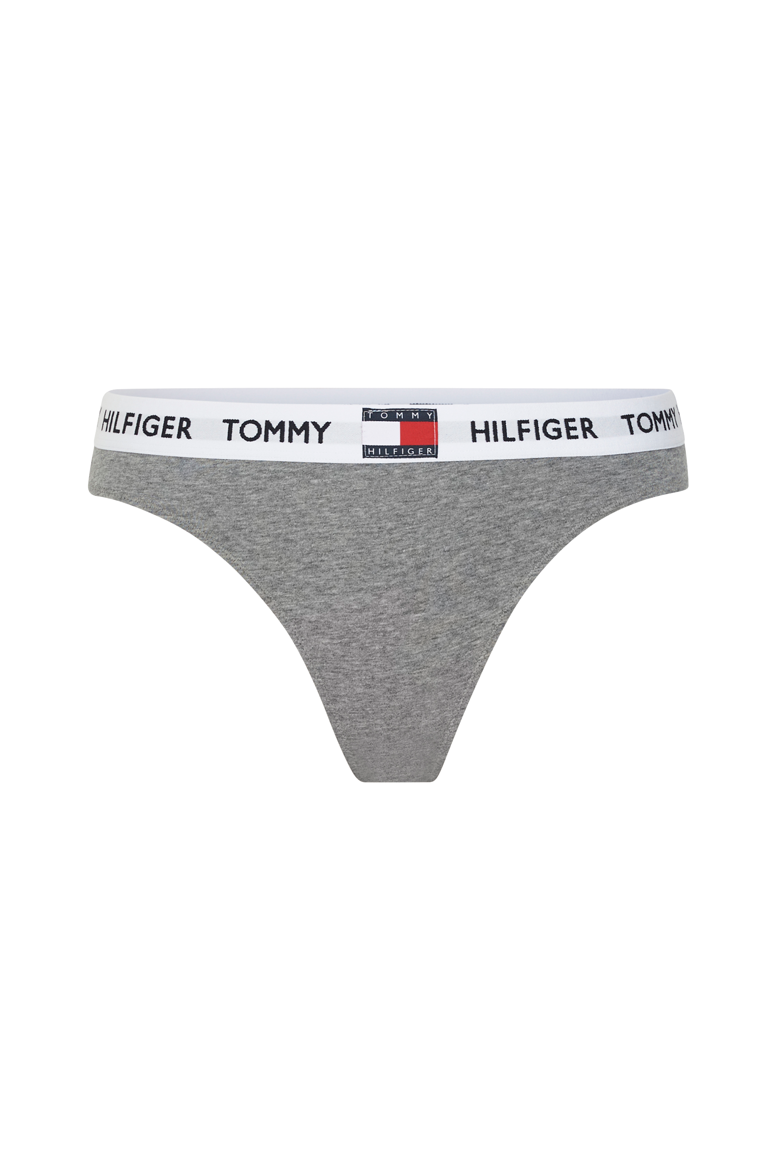 Stringtruse Thong fra Tommy Hilfiger i bomullstrikot med bred strikk med logo i midjen. Fôret skritt.