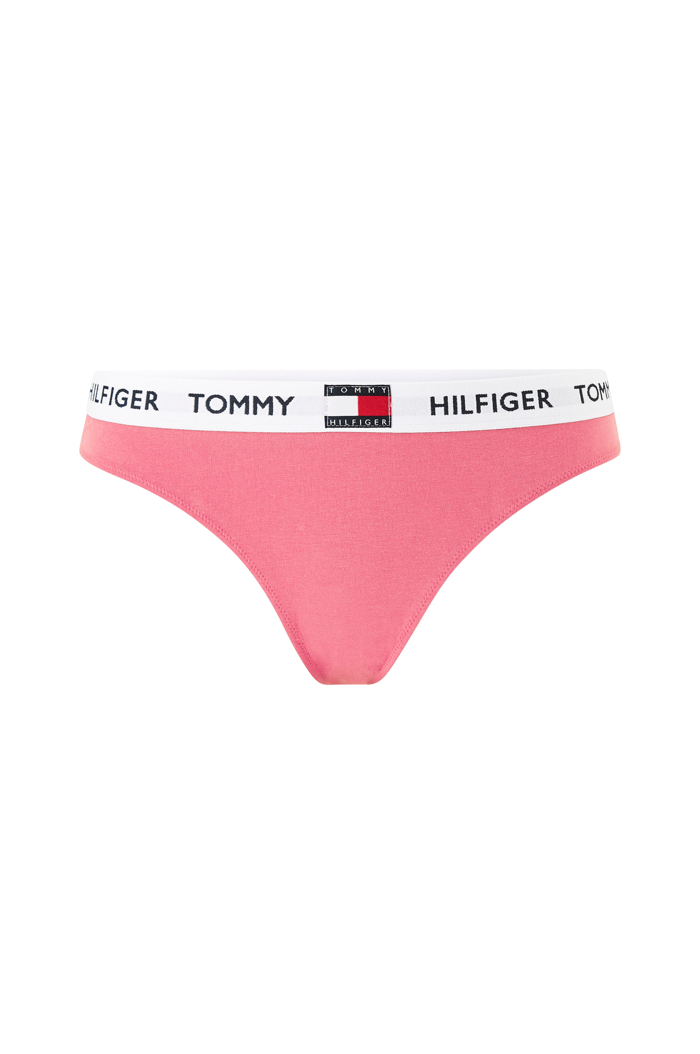 Stringtruse Thong fra Tommy Hilfiger i bomullstrikot med bred strikk med logo i midjen. Fôret skritt.