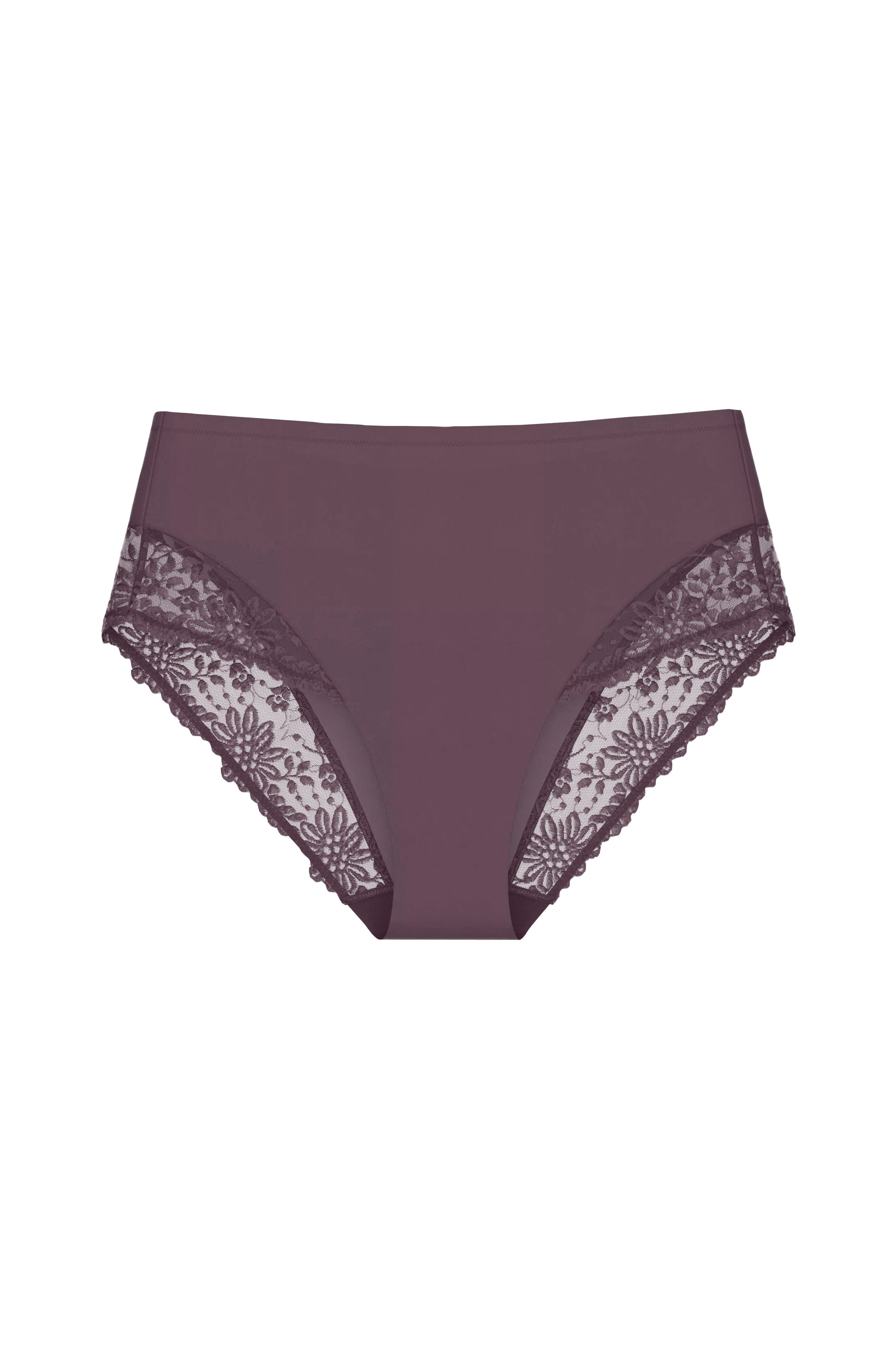 • Høy midje med tynn elastisk strikk• Blonder på benåpningene• Shaping-effekt• Foring foran og i skrittet
