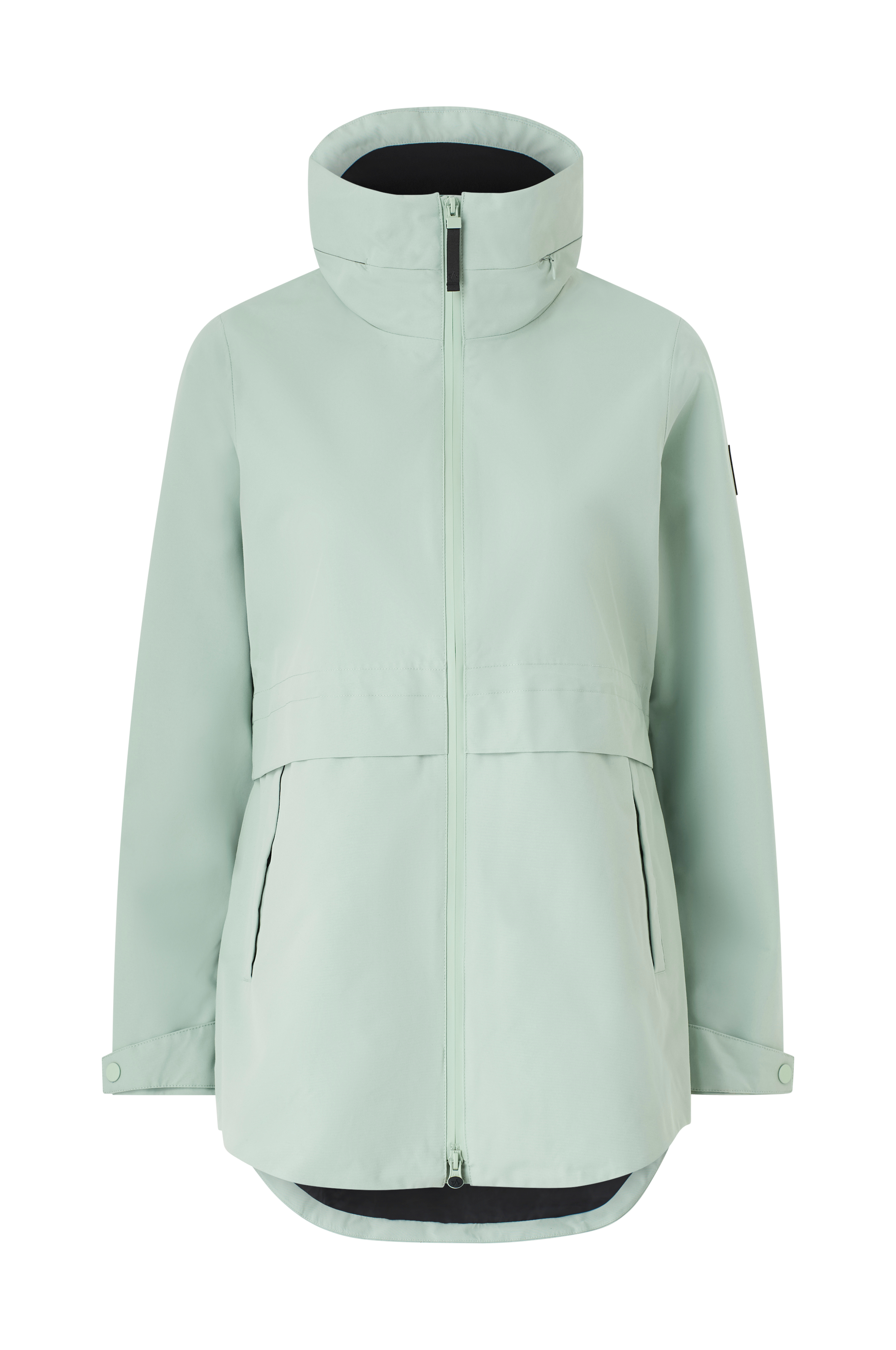 • Vanntett, vindtett skjell jakke • Teipede sømmer • Skjult hette innsiden av kragen • Høy krage med børstet jersey på innsiden • Vannavstøtende to-veis glidelås • Innvendig justering ved midjen • Sidelommer med trykknapp • Justerbar bredde i ermeslutten • Vannsøyle: 15 000 mm • Pustende egenskap: 10 000 g/m2/24 h • Lengde: 80 cm i størrelse 36