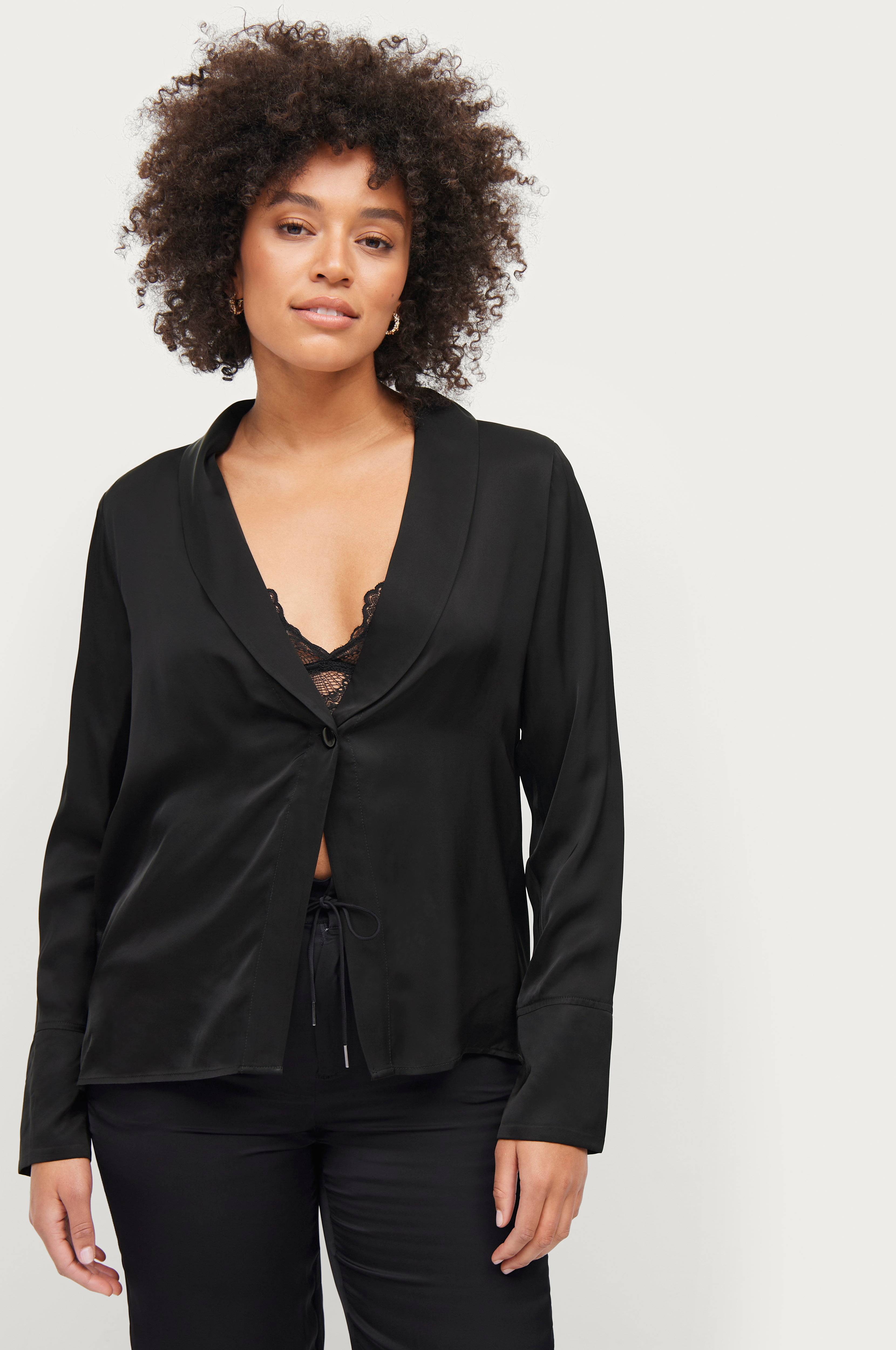 • Løs passform• Skinnende materiale• Dypt v-hals snitt• Lukning med en knapp• Langt erme