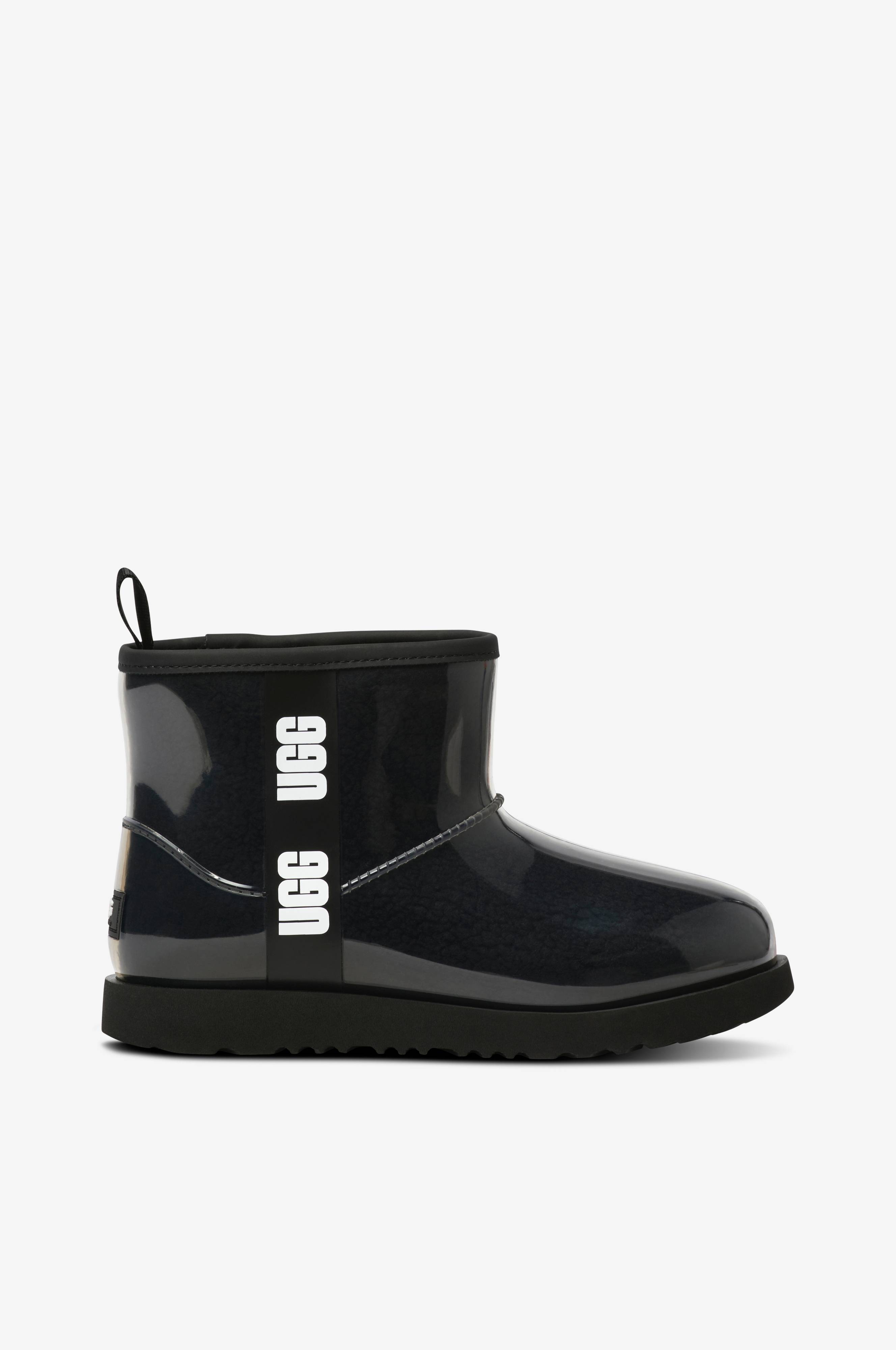Vanntett modell i gjennomsiktig plast med teddyfôr som delvis er i ull. Hempe bak på skaftet og uttagbar innersåle. Høy sålekant rundt.Skaftehøyde ca. 13 cm.