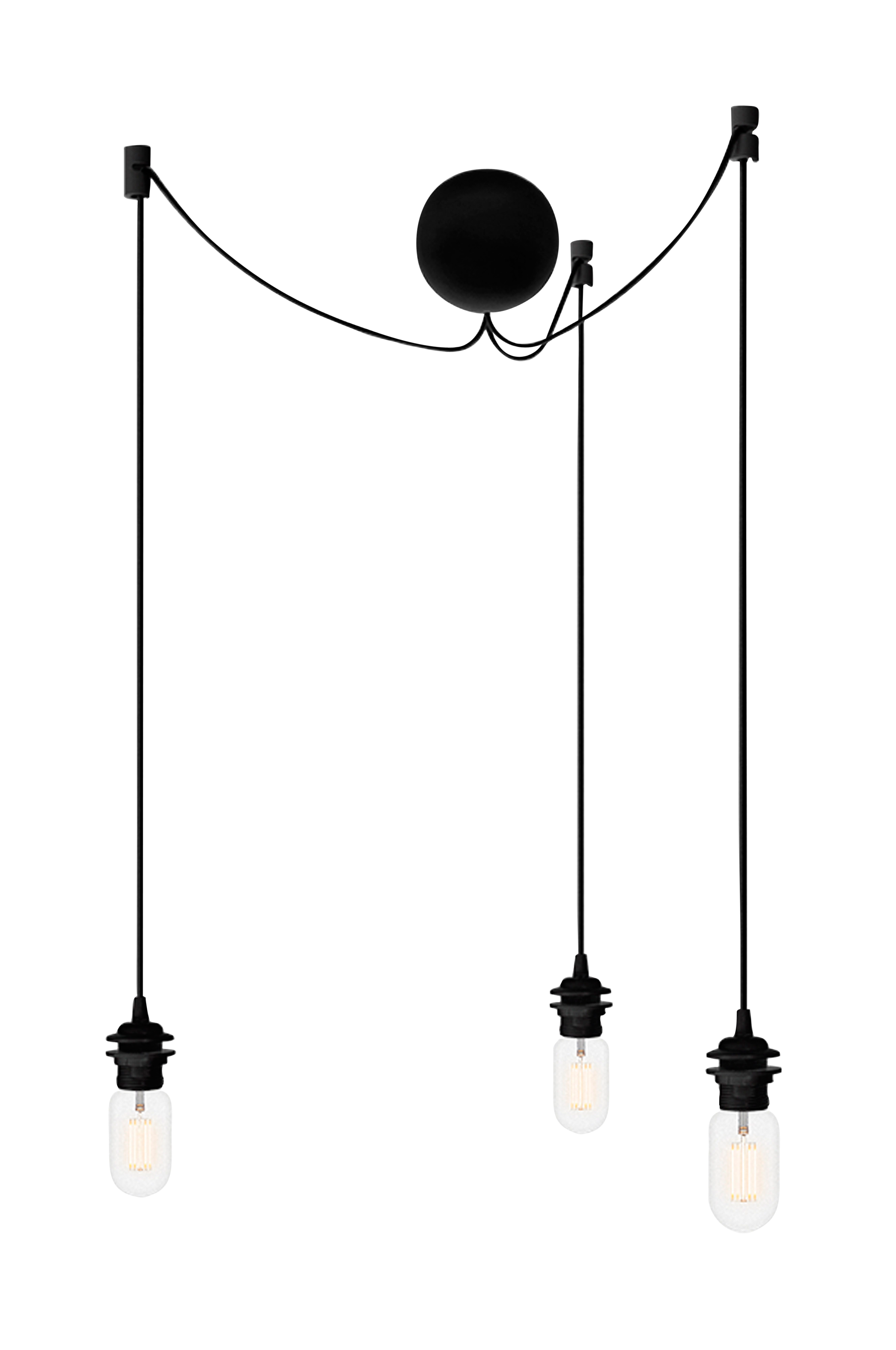 Sokkel i silikon, 2,5 m lampeledning i tekstil og uttak for tre lamper. Farge: Svart