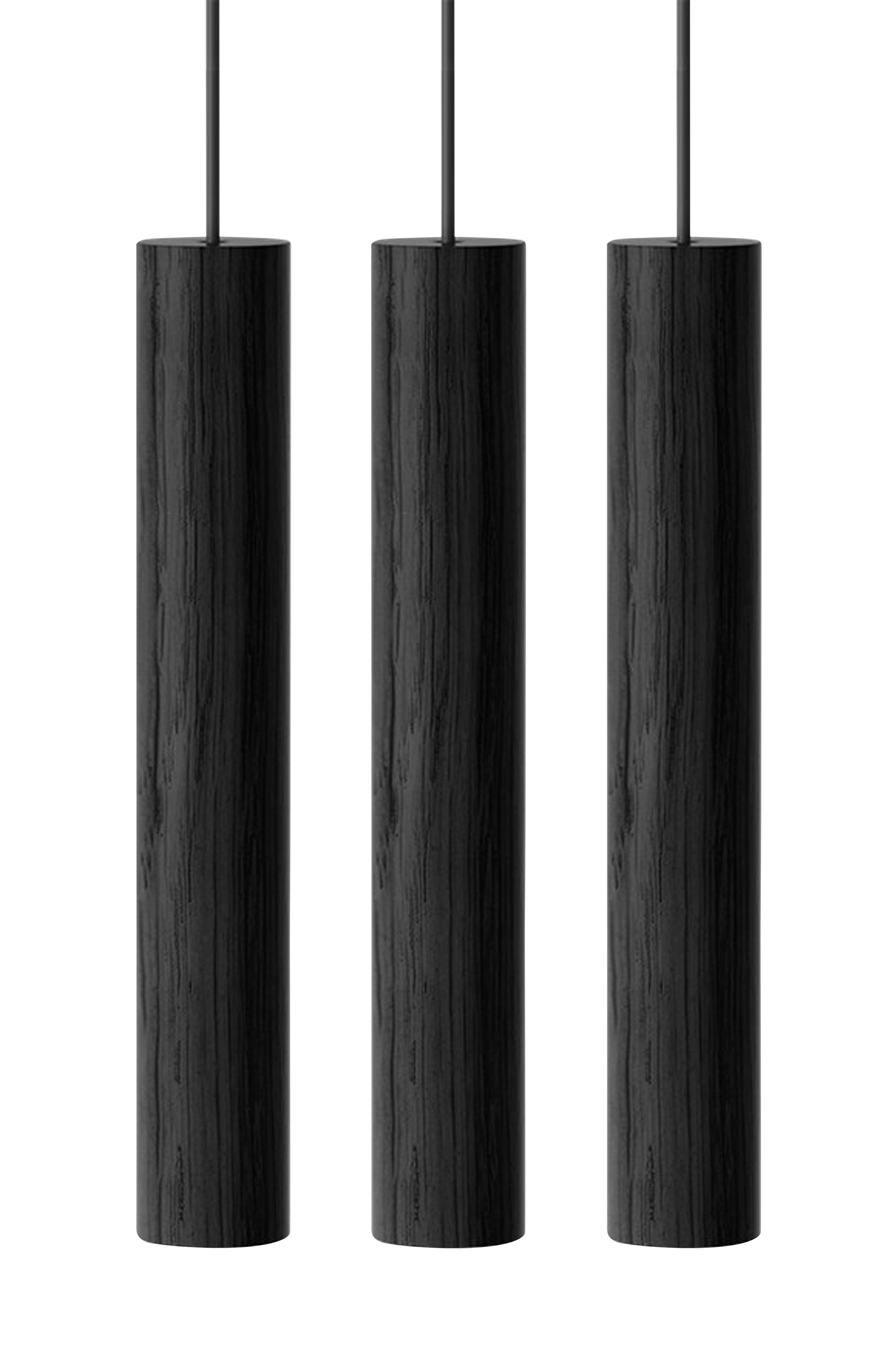 Chimes lamper i klase på tre, som henger fra en svart takkopp. Den enkle designen i solid eik i kombinasjon med varmt LED-lys tar inn den nordiske naturen i interiøret. Designen er inspirert av de grasiøse linjene som oppstår i en tett skog, med rekker av vakre trær som vokser inntil hverandre. Lampene gir en spotlyseffekt som lyser nøyaktig der du trenger det.