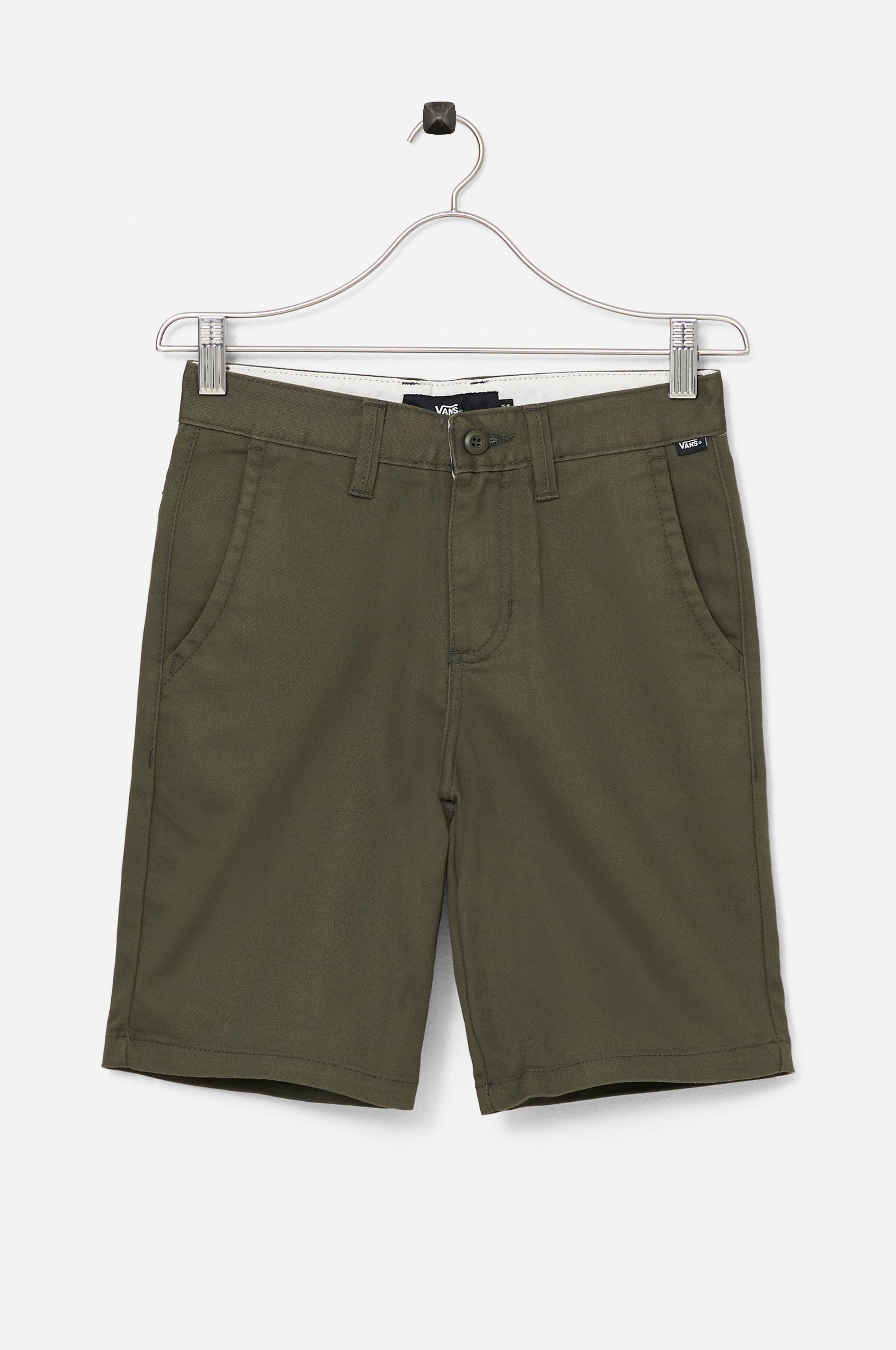 Shorts med litt lenger ben med to forlommer og innfelte passepoillommer med knapp bak. Linning med hemper og glidelås i gylfen.