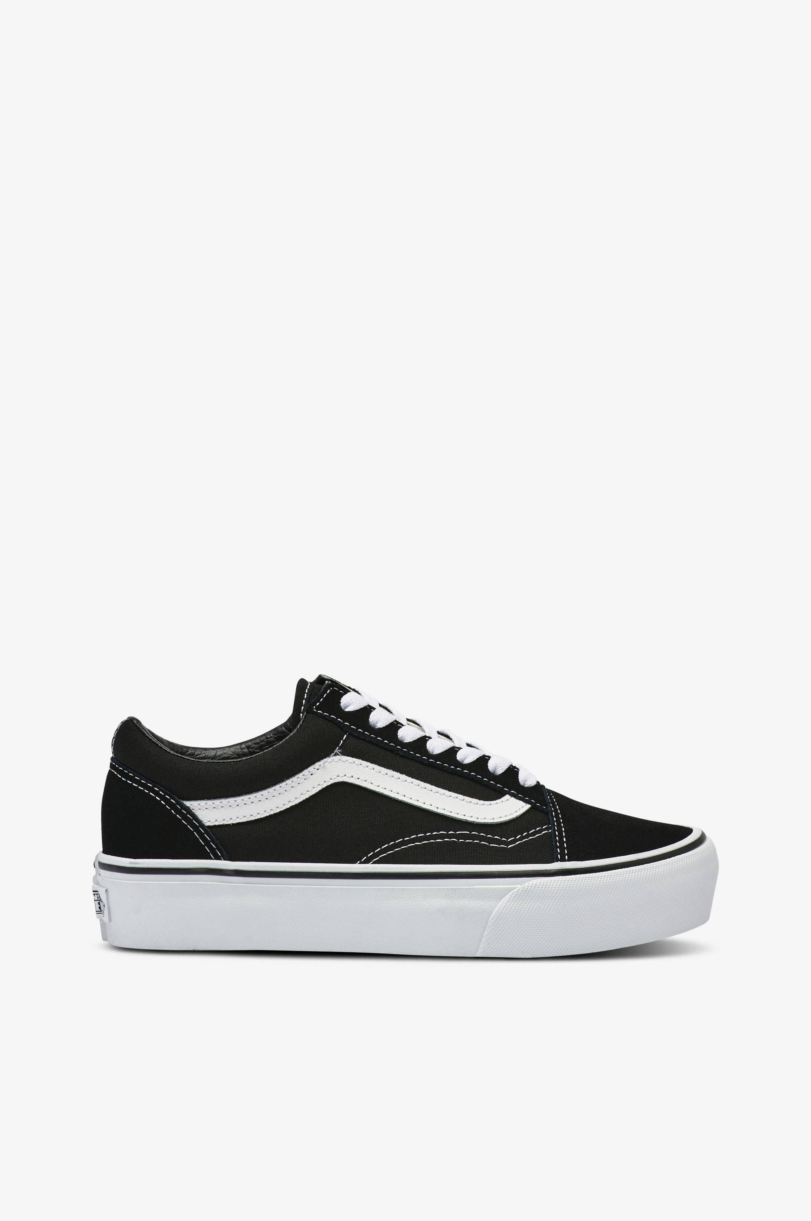 UA Old Skool Platform fra Vans er i tekstil med semsket skinn over tå og hæl. Behagelig vattert rundt kanten. Opptrukket sålekant med Vans-merke midt bak på sålekanten. Innersålen er mykstoppet.