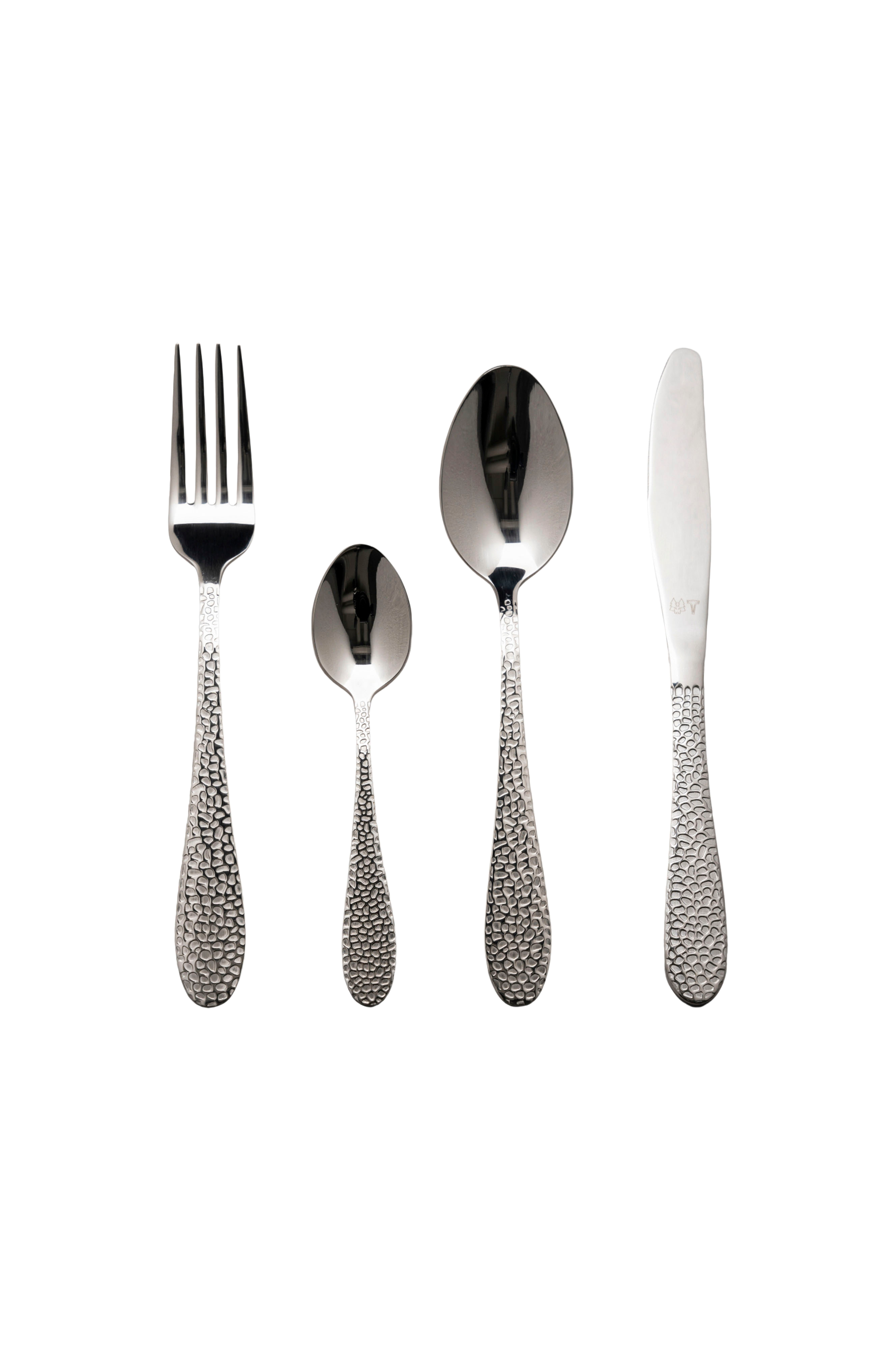 Dette er et skinnende bestikksett fra Vargen & Thor med deres ikoniske, hamrede design.