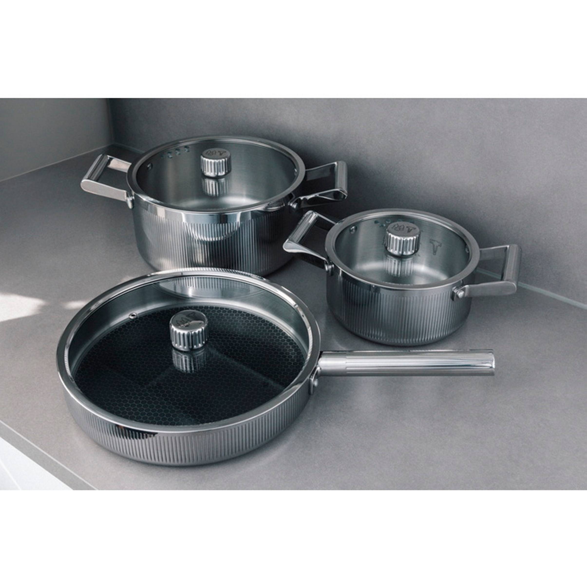 Fungerer på induksjon, tåler stekeovn og oppvaskmaskin.