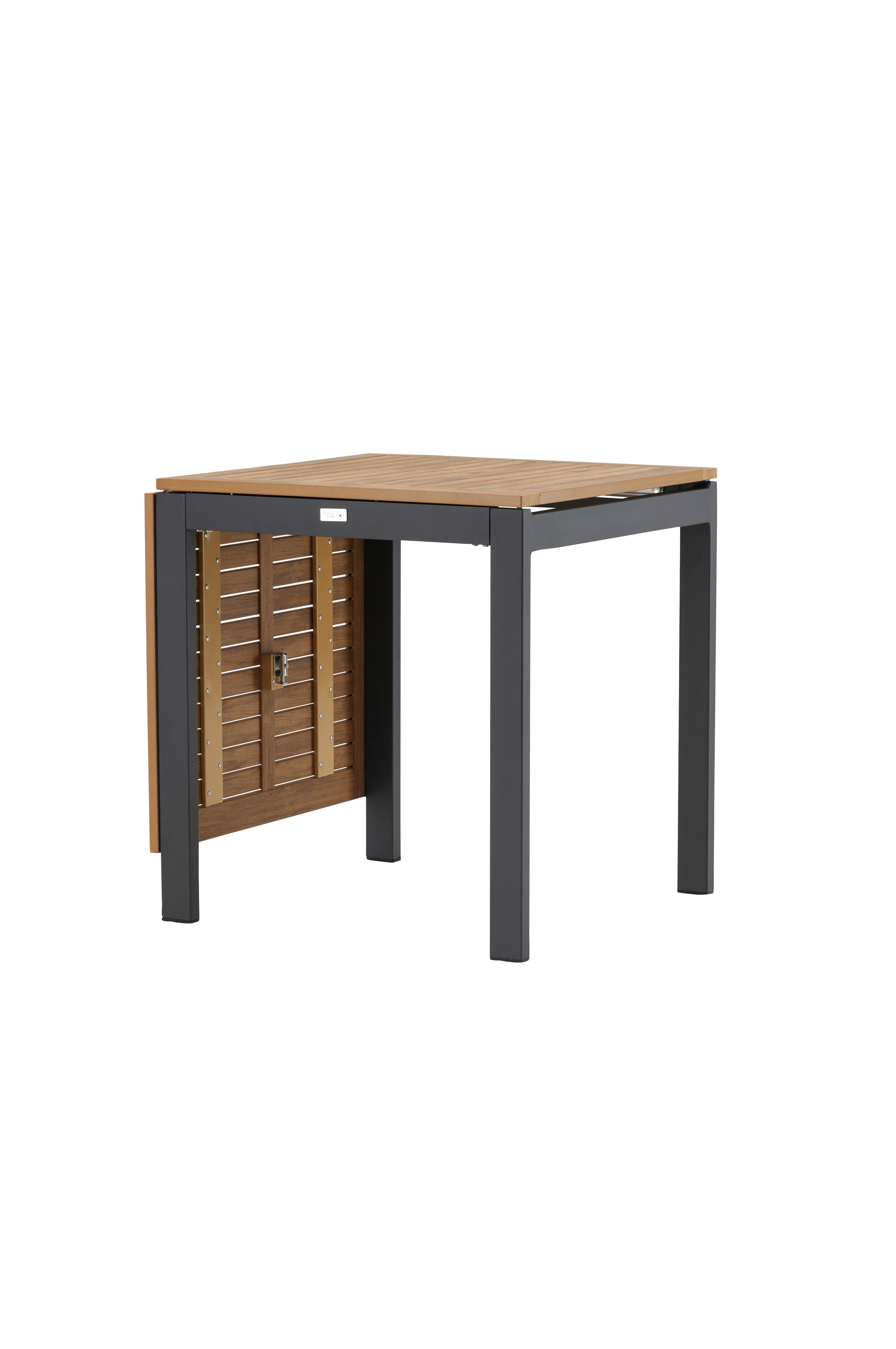 Kafebordet Diego er like smart som stilrent i smekker skandinavisk design! Bordplaten er produsert i aintwood og bena i aluminium. De rette nordiske formene er tidløse. En enkel konstruksjon gjør at du enkelt feller opp eller ned forlengelsesplatene langs sidene ved behov. Perfekt for frokost eller lunsj ute en solrik sommerdag!