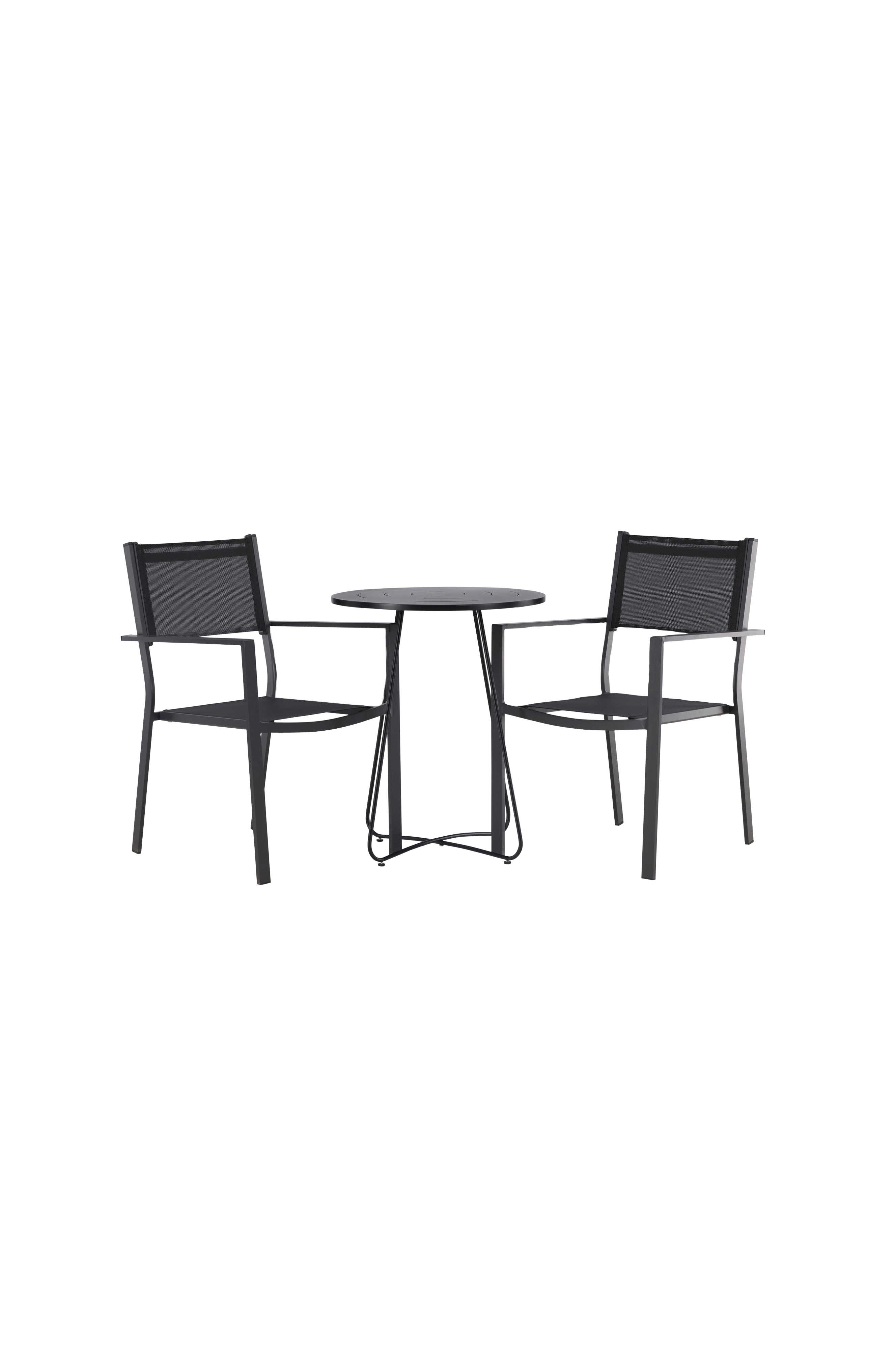 Denne kafegruppen er like matchende som tidløs! Det nette kafebordet fra serien Bacong har rund bordplate og smale ben i stål. Her i pen kombinasjon med stabelbare spisestoler fra serien Copacabana. Stolene har rette nordiske former med sete i Textilene og ben i aluminium. Dekk på til lunsj i sommer, og nyt hyggelige stunder!