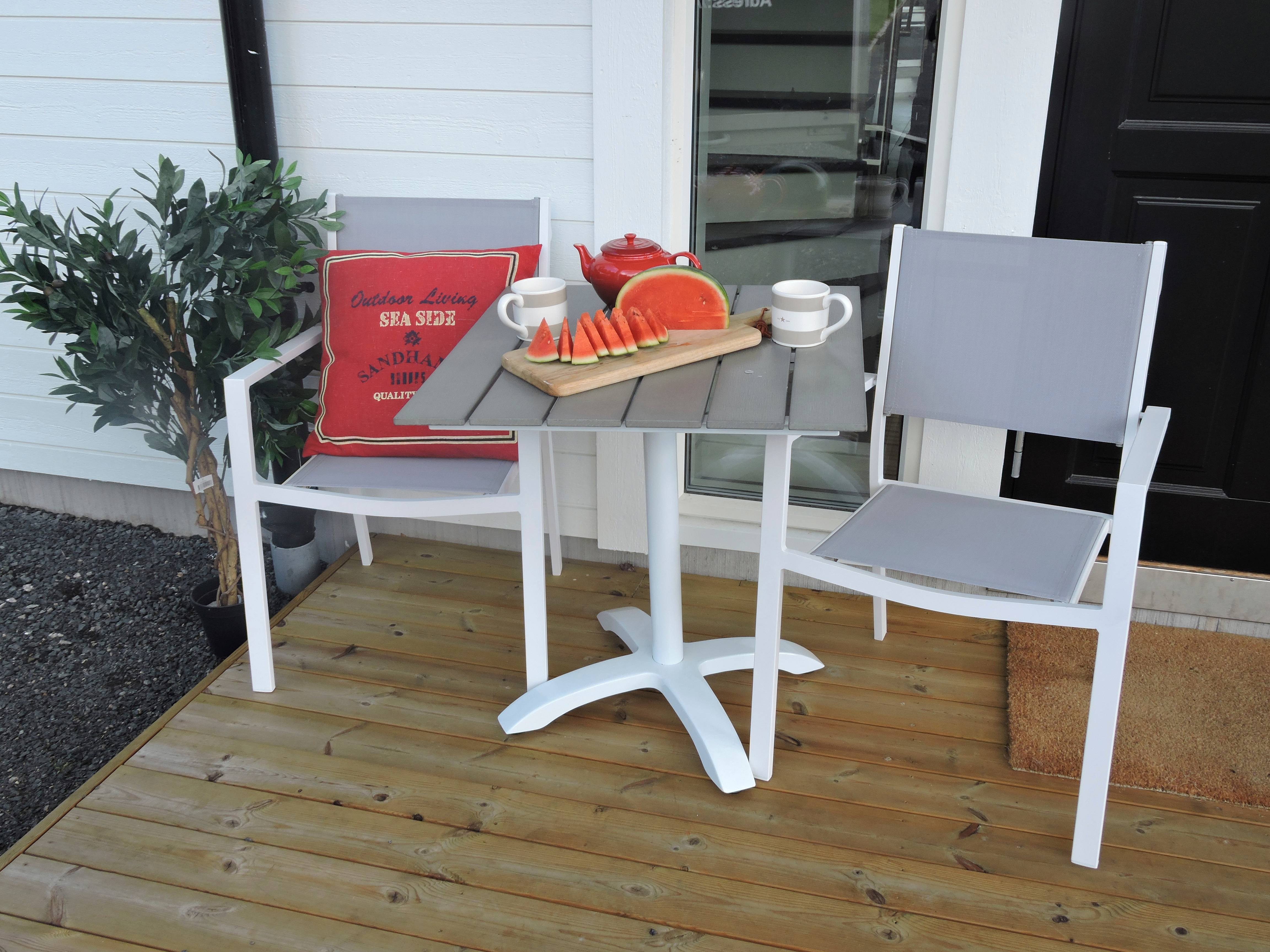Lekker matchende kafegruppe til uteområdet! Colorado er et klassisk kvadratisk spisebord i nett design og størrelse. Bordplaten er i aintwood og understellet i slitesterk aluminium, noe som gjør at bordet egner seg perfekt for utendørs bruk. Her sammen med 2 stk spisestoler fra serien Copacabana. Stolene er stabelbare for smart oppbevaring, har sete i Textilene og rette ben i aluminium. Dekk på til utelunsj i sommer, og nyt hyggelige stunder!