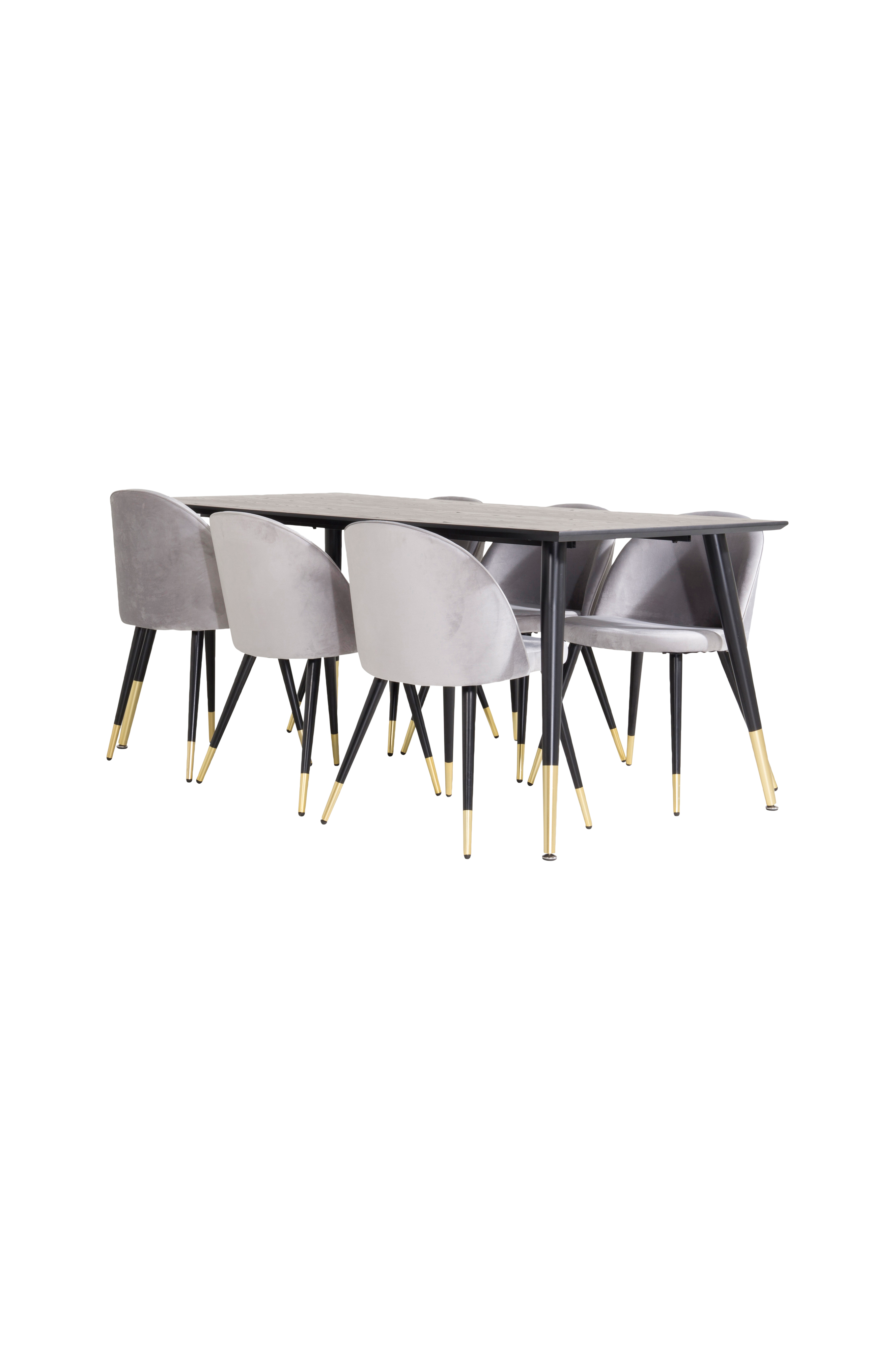 Doris er en spisegruppe med et rektangulært, stilrent spisebord med pulverlakkert bordplate av MDF og messingfargede detaljer på bena. Mål bord: 90 x 180, høyde 75 cm. Matches med 6 stk fløyelstrukne stoler med messingdetaljer på svarte stolben. Mål stol: høyde 77, dybde 54,5, bredde 49,5 cm. Sittehøyde 47 cm, sittedybde 43 cm. Bord og stoler krever enklere montering.