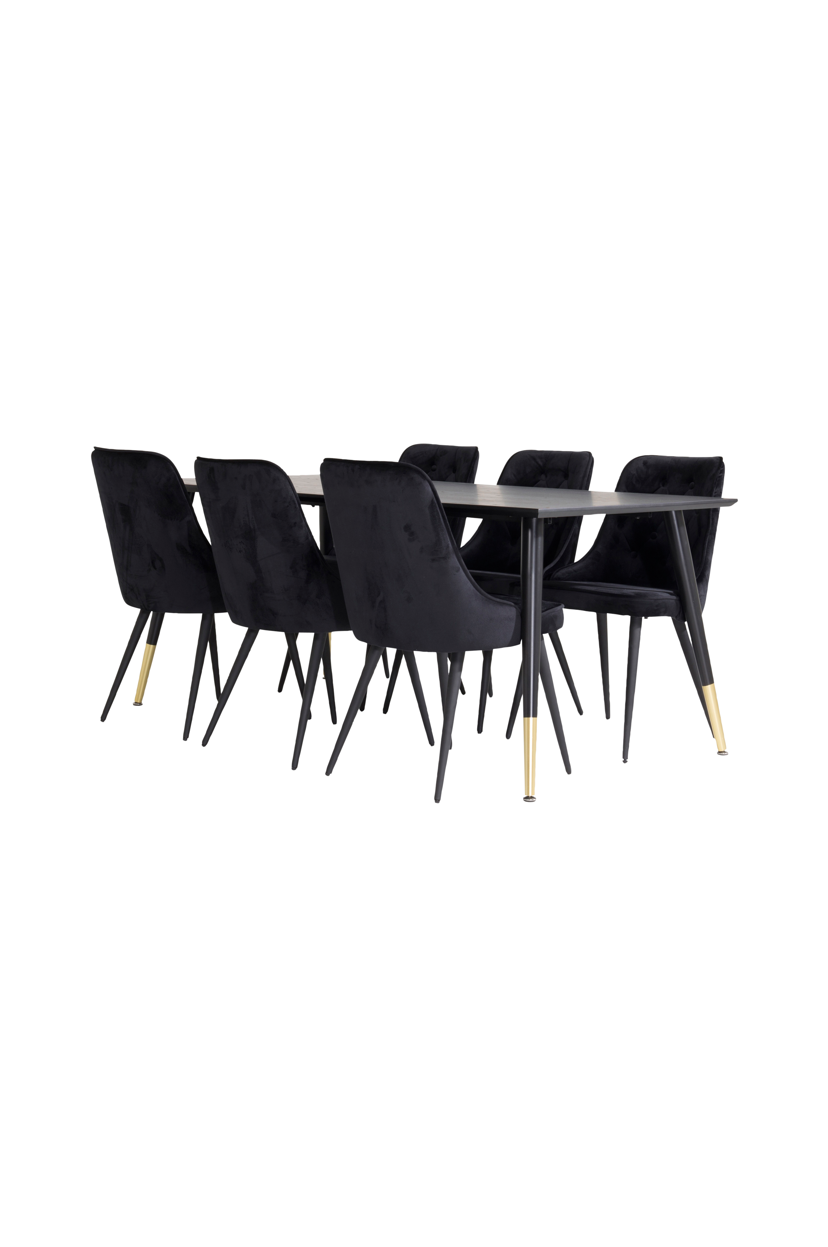 Doris spisegruppe består av et rektangulær stilrent spisebord med en pulverlakkert bordplate i MDF og messingfargede detaljer på bena. De 6 stolene som matcher er elegante fløyelsstoler med metallben. Mål stol: høyde 90, dybde 63, bredde 51 cm. Sittehøyde 49 cm. Mål bord: 90 x 180, høyde 75 cm. Bord og stoler krever enklere montering.
