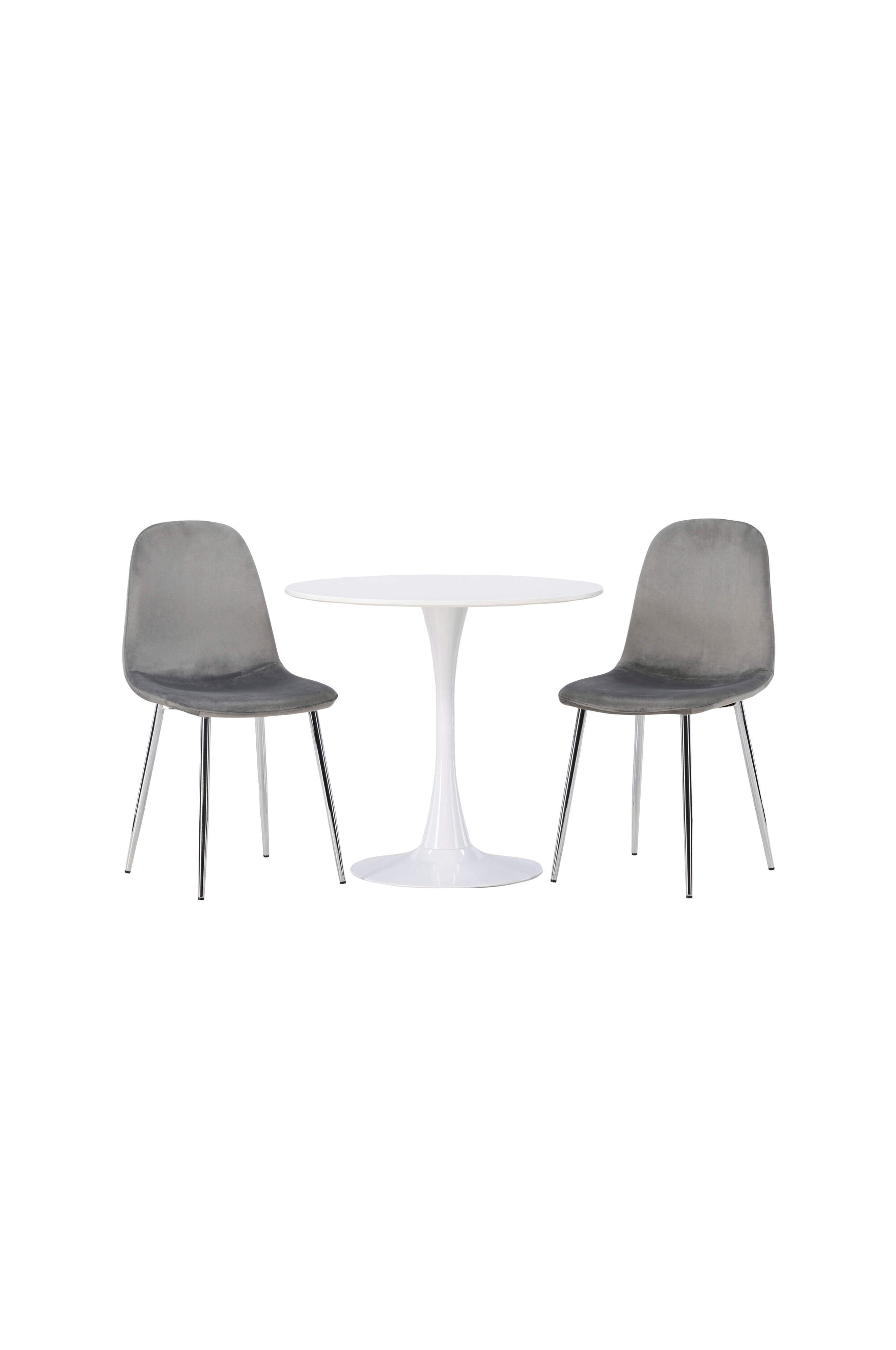 Stilren fargekombinasjon! Det runde spisebordet Hamden har en tynn bordplate i MDF og stilren trompetfot i stål. Her i moderne kombinasjon med spisestoler fra serien Eva. Stolen har helkledd design med ben i forkrommet metall, lett avrundet rygg og sete i pent fløyelsstoff med myk polstring for ekstra komfort. Slå deg ned og sitt behagelig fremover!