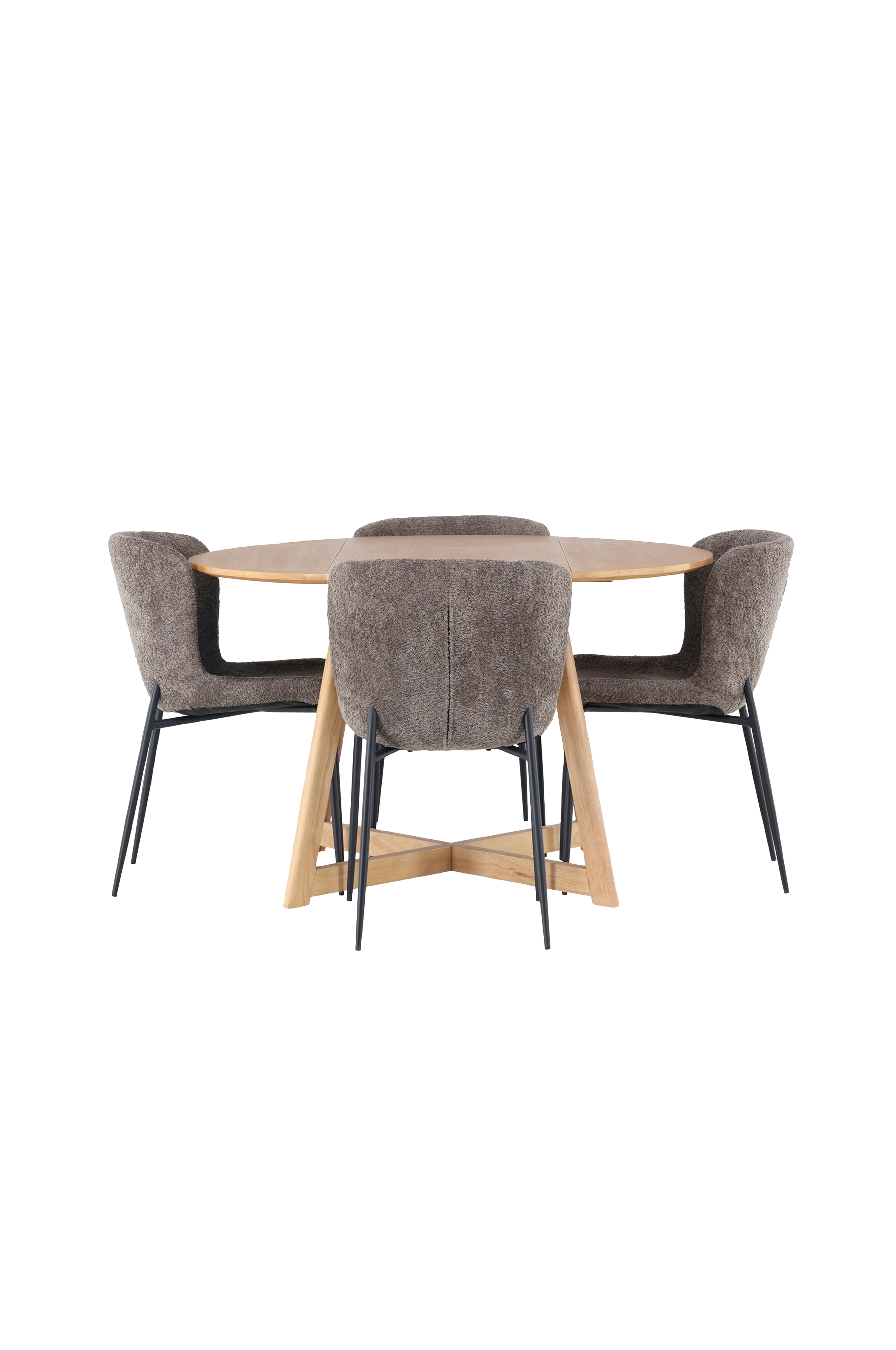 For å komplettere det pene spisebordet er det matchet med spisestoler fra Modesto-serien. Disse stolene har en moderne design med helkledd loddent stoff som gir en koselig følelse. De smale stolbena i metall gir en kontrastfull touch og forsterker spisegruppens stilrene utseende.