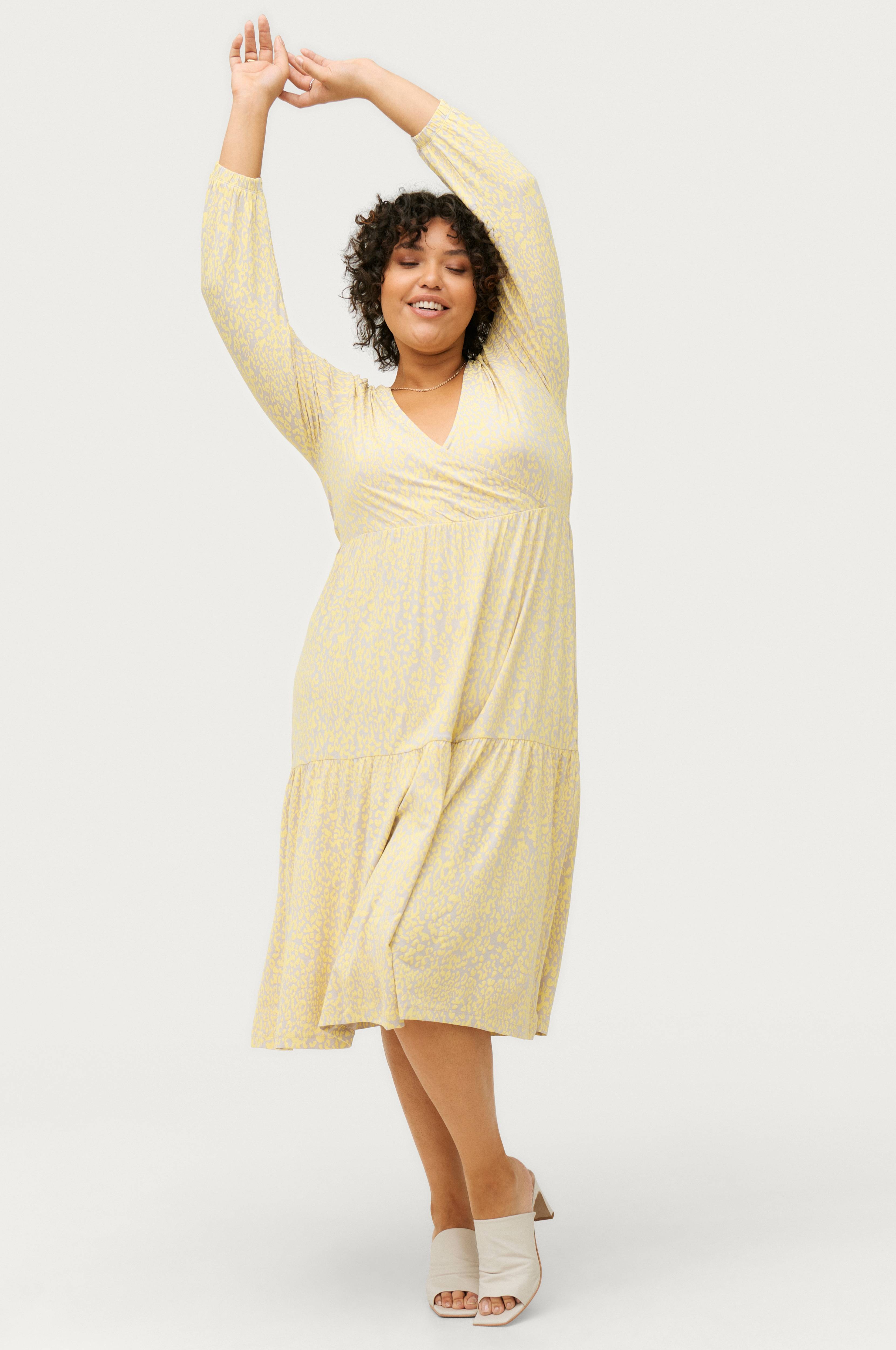 • V-hals snitt med omslag • Elastisk, samlet midje • Elastisk strikk i ermeslutten • Utsvingt skjørt med volang • Plusstørrelser • Lengde: 122 cm i størrelse S • Produktet er sertifisert iht. STANDARD 100 by OEKO-TEX®. Sertifiseringen garanterer at produktet er testet og uten stoffer som kan være skadelige for helse og miljø. Lisensnummer & testinstitutt: 13.HBD.31810 HOHENSTEIN HTTI