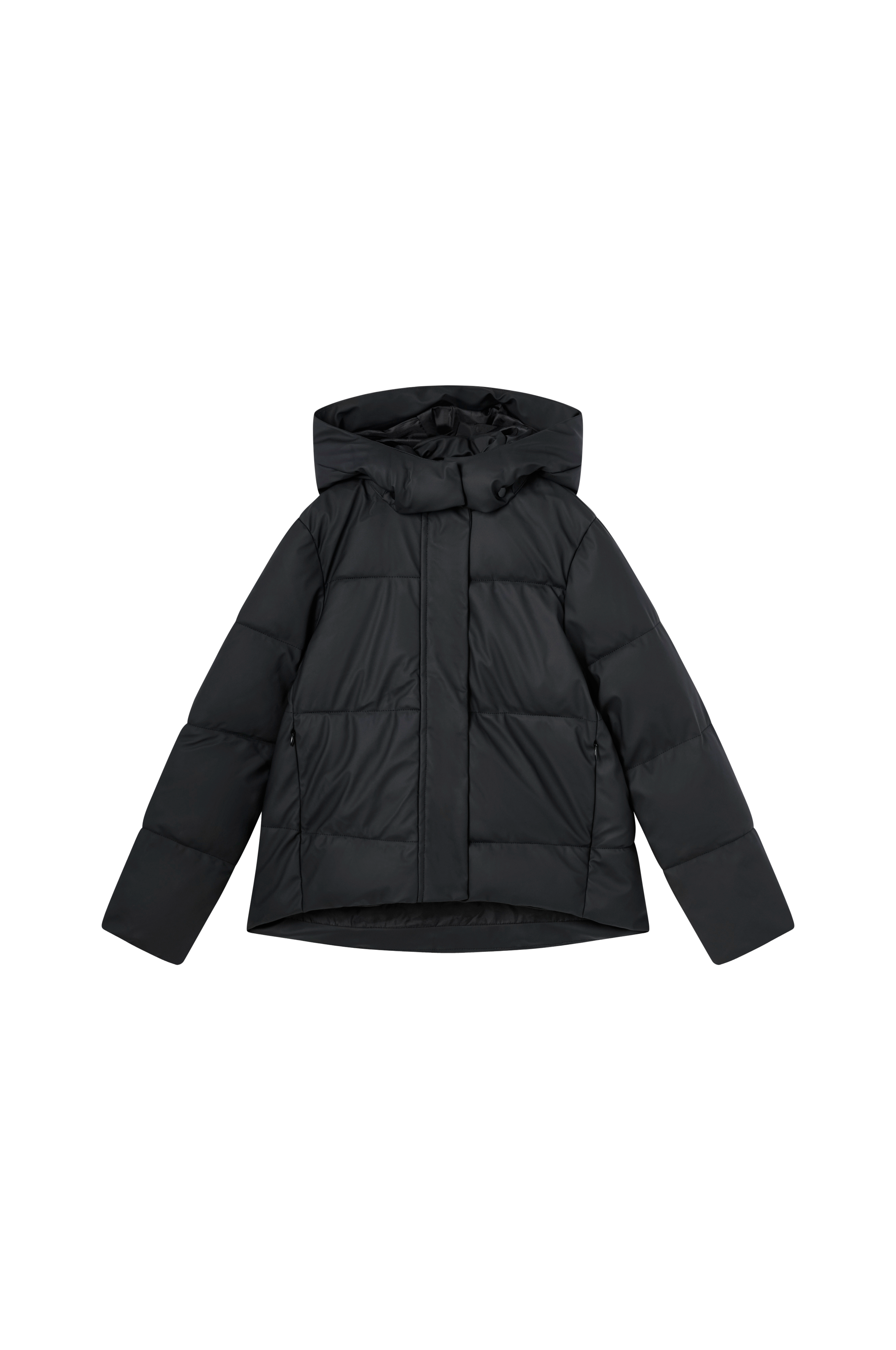 • Polstre, vannavstøtende jakke med belagt overflate• Høy krage med hette• Glidelåslukking med klafflomme og trykknapper• Skjulte glidelåslommer i sidene• Litt lengre bakside med avrundet hem• Vevd innsidefôr