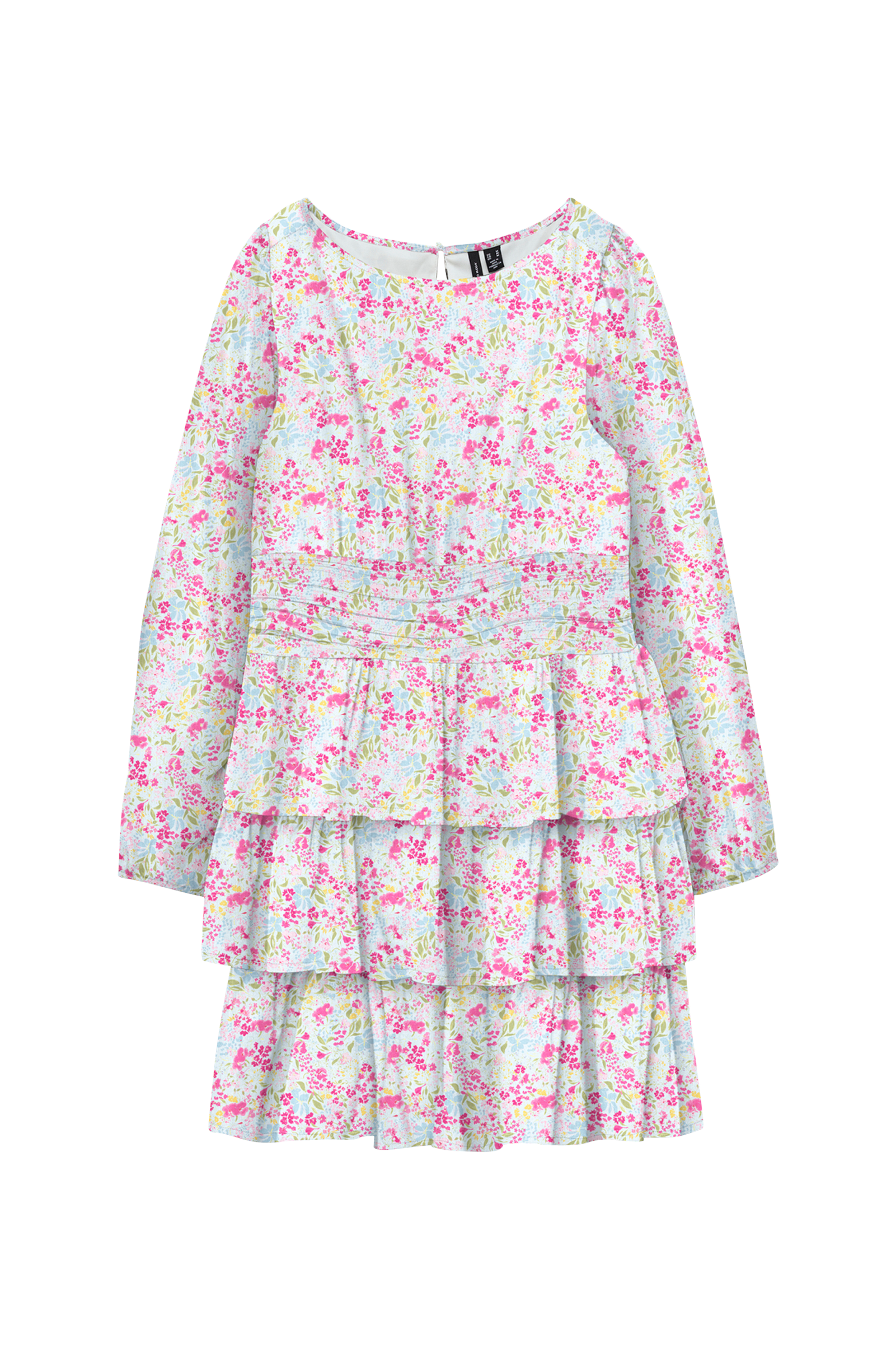 • Kjole i chiffon• Rund halsringning• Skjær med knapp i nakken• Lange puffermer• Vaffelsøm i midjen bak• Volanger på bunnen• Tekstilfôr