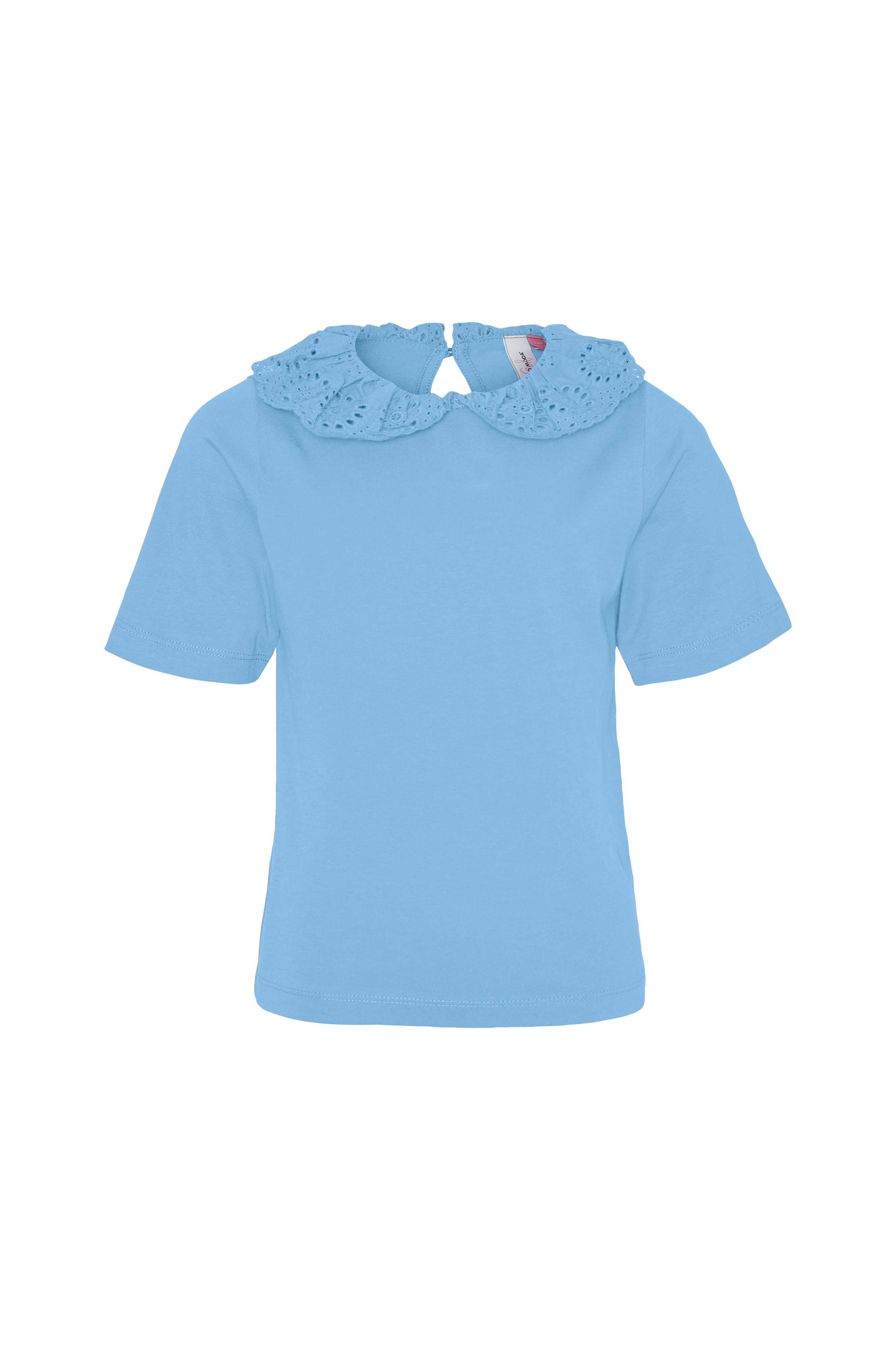 • Topp i bomullsjersey• Korte ermer• Krage med brodert hullmønster• Åpning med knapp i nakken