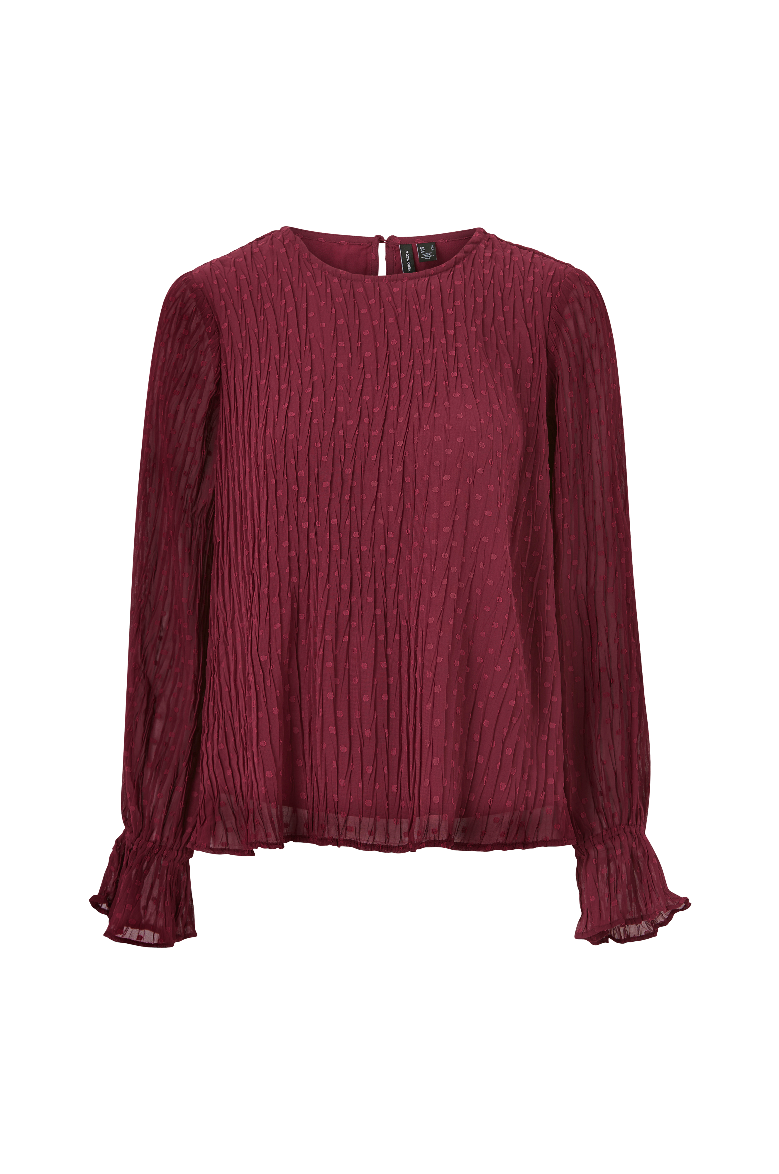 Bluse vmAlberte L/S Pleat Top fra Vero Moda i krinklet chiffon med teksturmønster. Lange ballongermer med rynkede skuldersømmer og strikk med volang i ermekantene. Rund hals med splitt og kledd knapp i nakken. Fremstilt i vevd kvalitet.