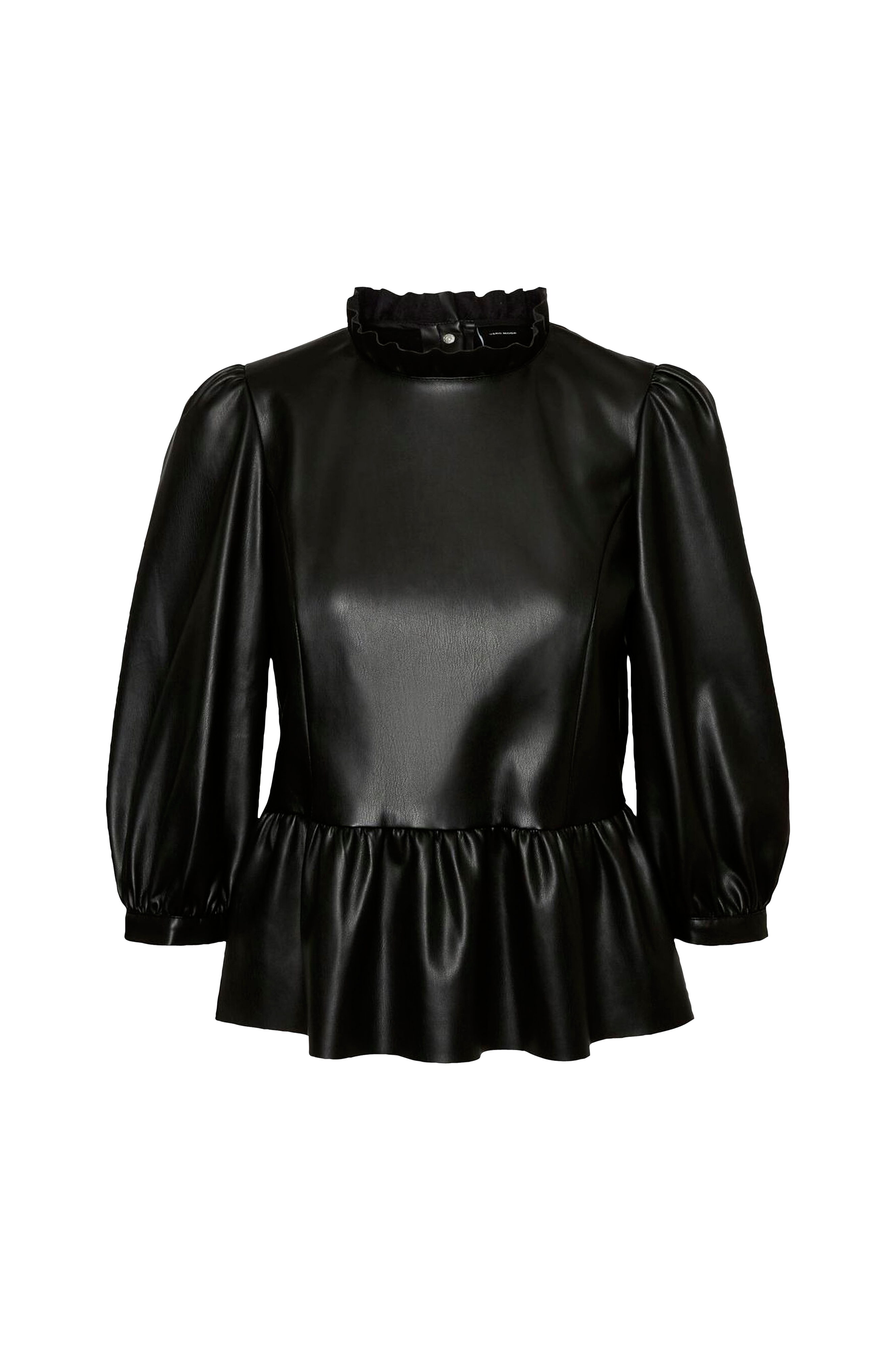 Bluse vmButter Lee Coated Short Top fra Vero Moda i skinnimitasjon med myk innside. Peplumvolang nederst, 3/4-lange puffermer og foldet ståkrage. Trykknapper i ryggen og ufaldet nederkant.