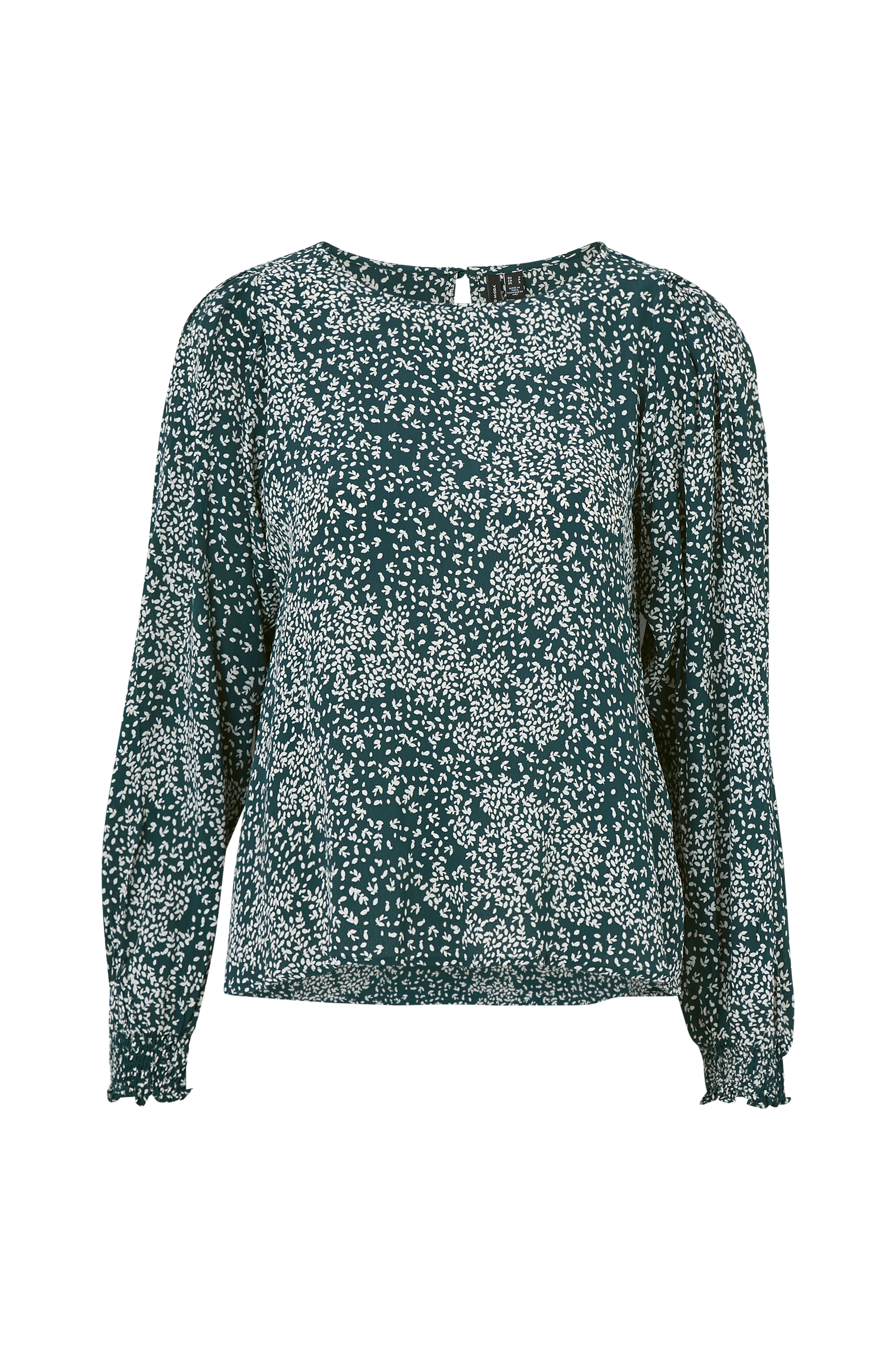 Bluse vmCaitlynn L/S Smock Top fra Vero Moda. Rett modell i mønstret crêpekvalitet med rund hals som har liten fald og splitt med knapp i nakken. Lange, ekstra vide puffermer med rynker ved skuldrene og vaffelsøm i ermekantene.