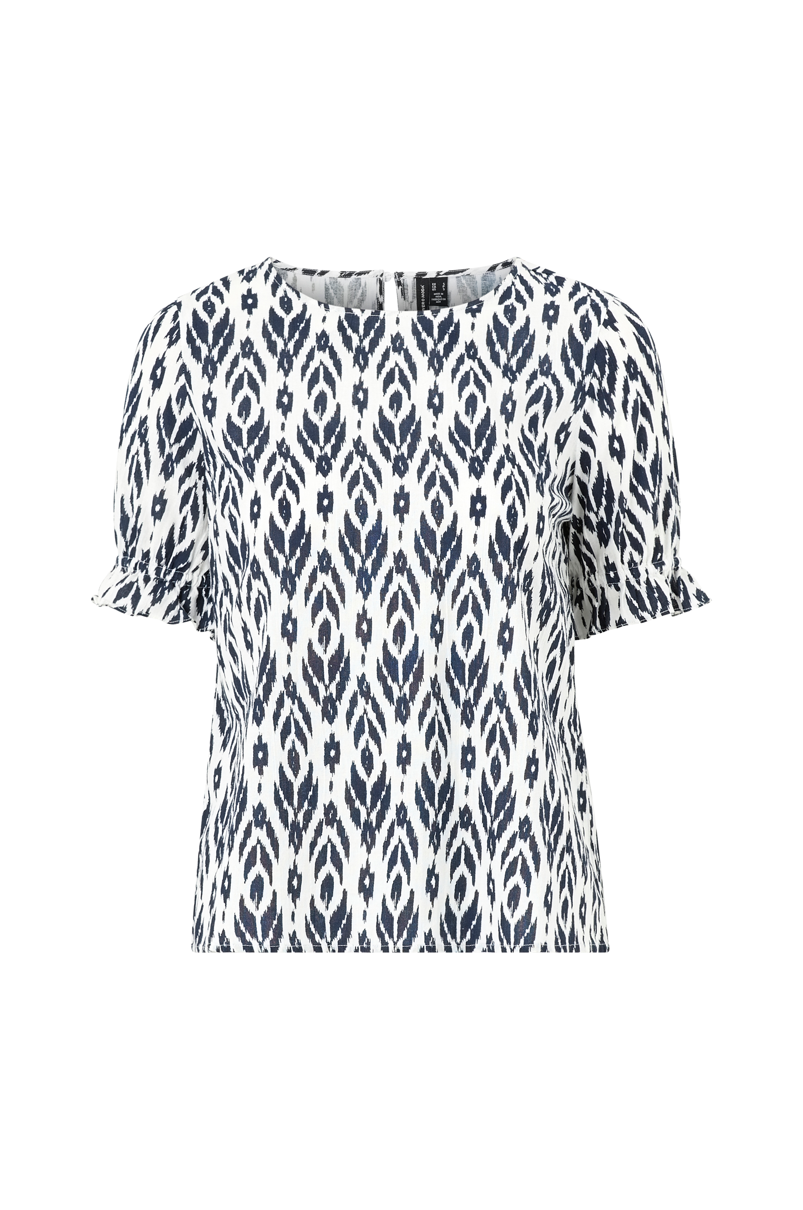 Bluse i mønstrete økobomull. Korte ermer med strikk og volang i ermekantene og rund hals med splitt og kledd knapp i nakken.