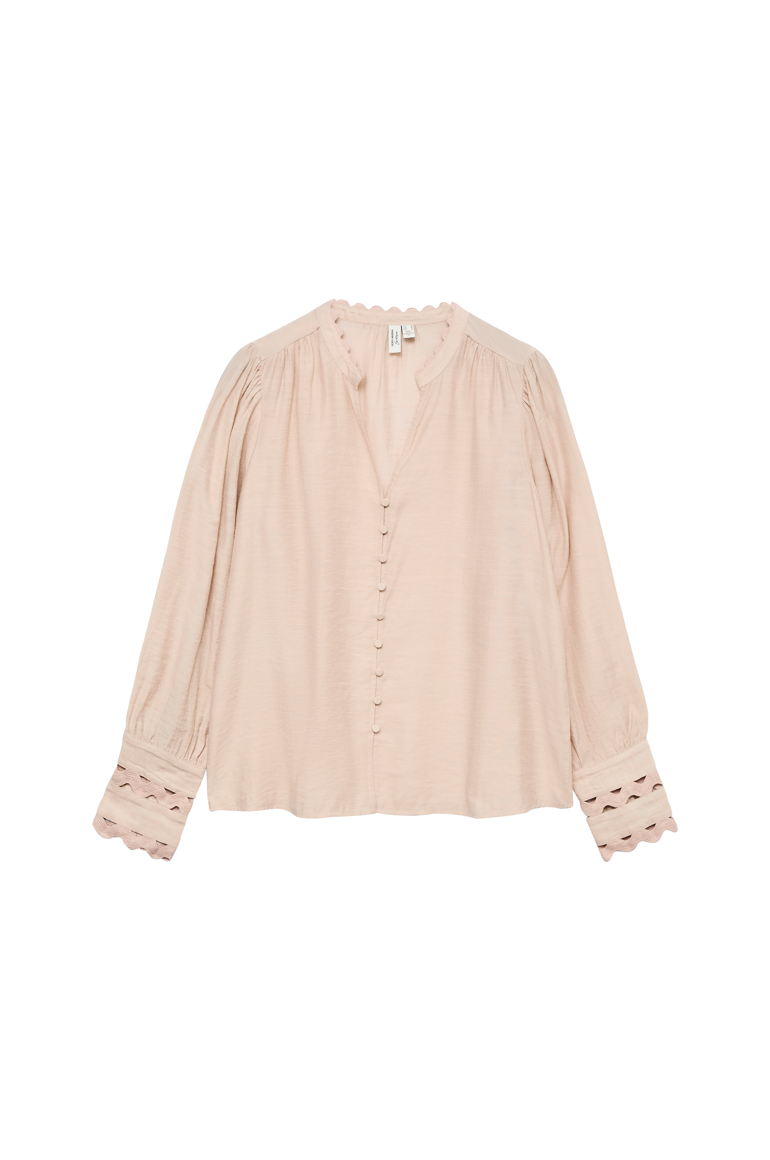 • Bluse i lett skrukket materiale• V-formet hals med krage• Kledde knapper foran• Lange puffermer med mansjetter i ermeslutten• Bølgede, broderte detaljer på kragen og på ermene