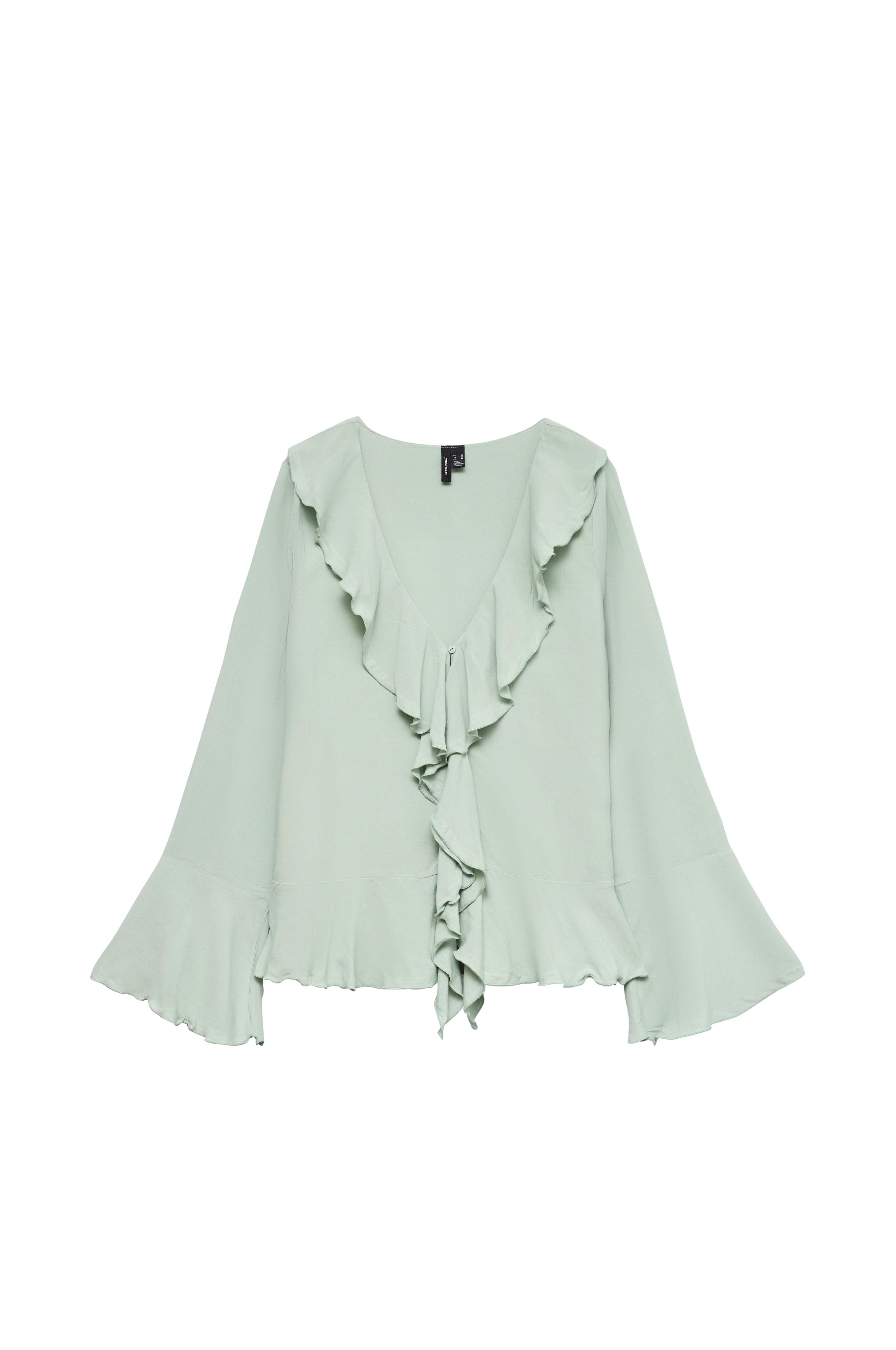 • Bluse med åpen fremside• V-formet hals med volang rundt og foran• Skjulte knapper foran• Lange ermer med volanger i ermeslutten• Volang på bunnen