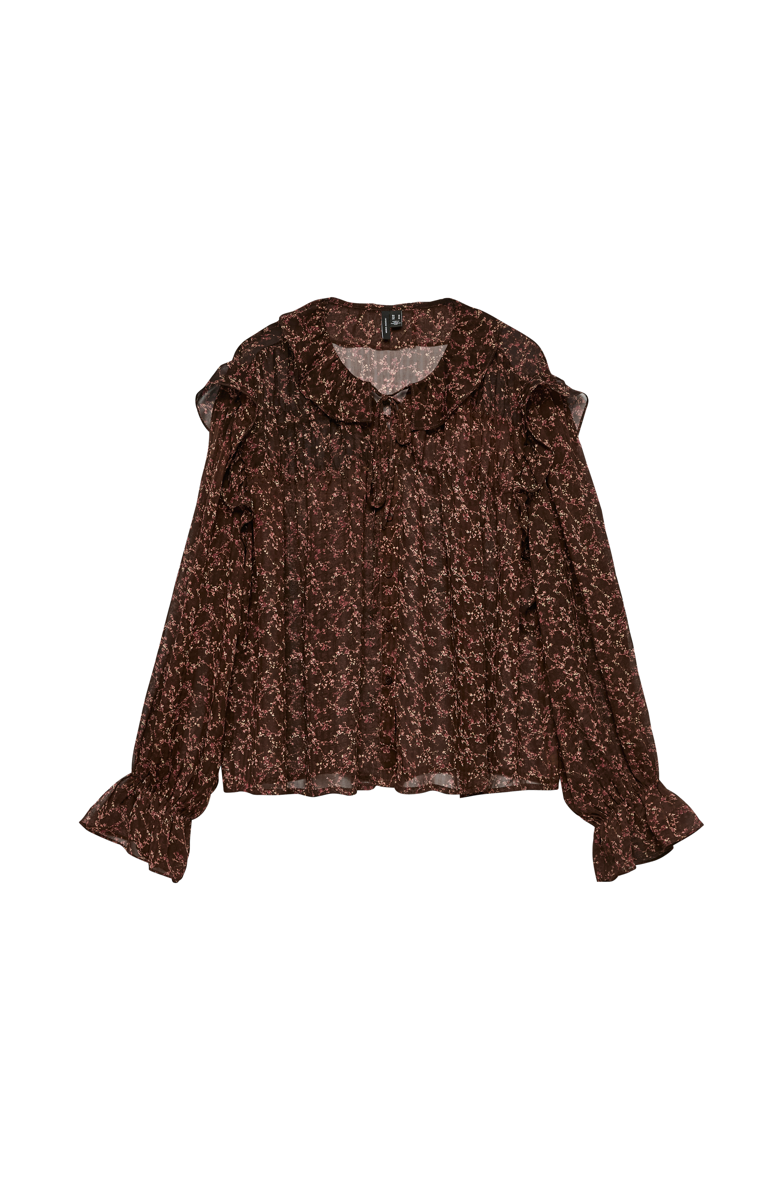 • Mønstret, gjennomsiktig bluse med knapper foran• Rund hals med volangkrage og knutedetalj• Lange ermer med volanger rundt skuldrene og i ermeslutten