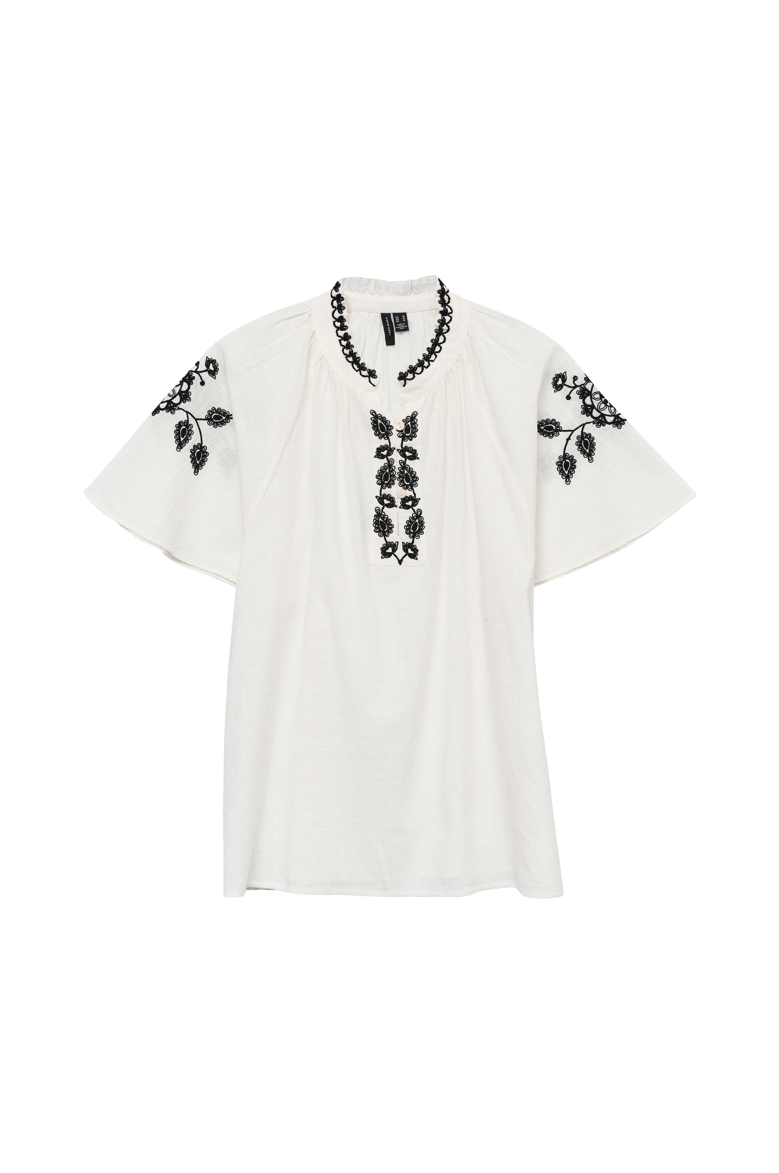 • Bluse med slubstruktur• Hals med skjær og volang• To knapper i utringningen• Brede, korte korte ermer• Broderte detaljer på skuldrene og på halslinjen