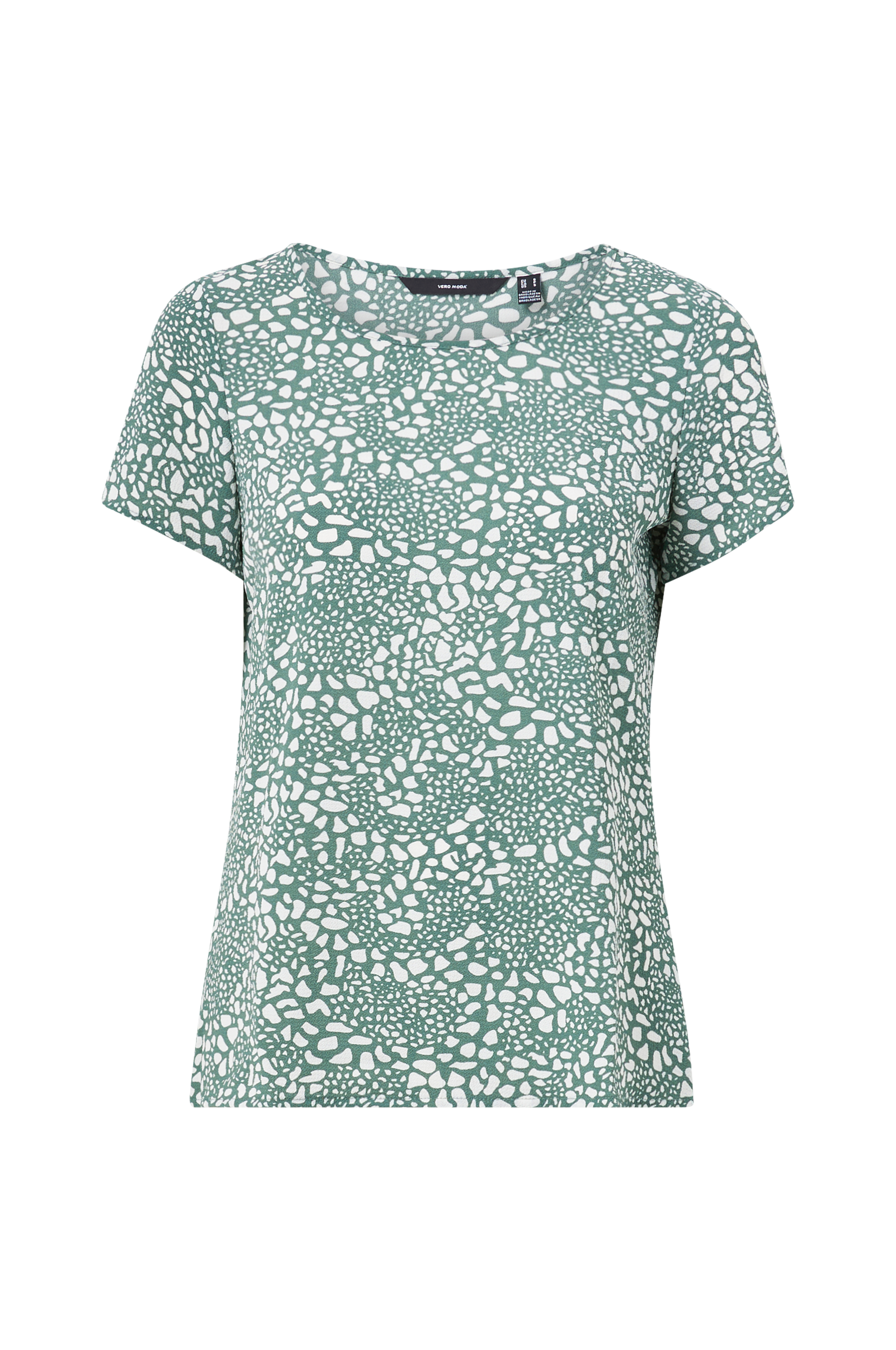 Mønstret bluse i vevd, kreppet kvalitet. Korte ermer og rund hals.