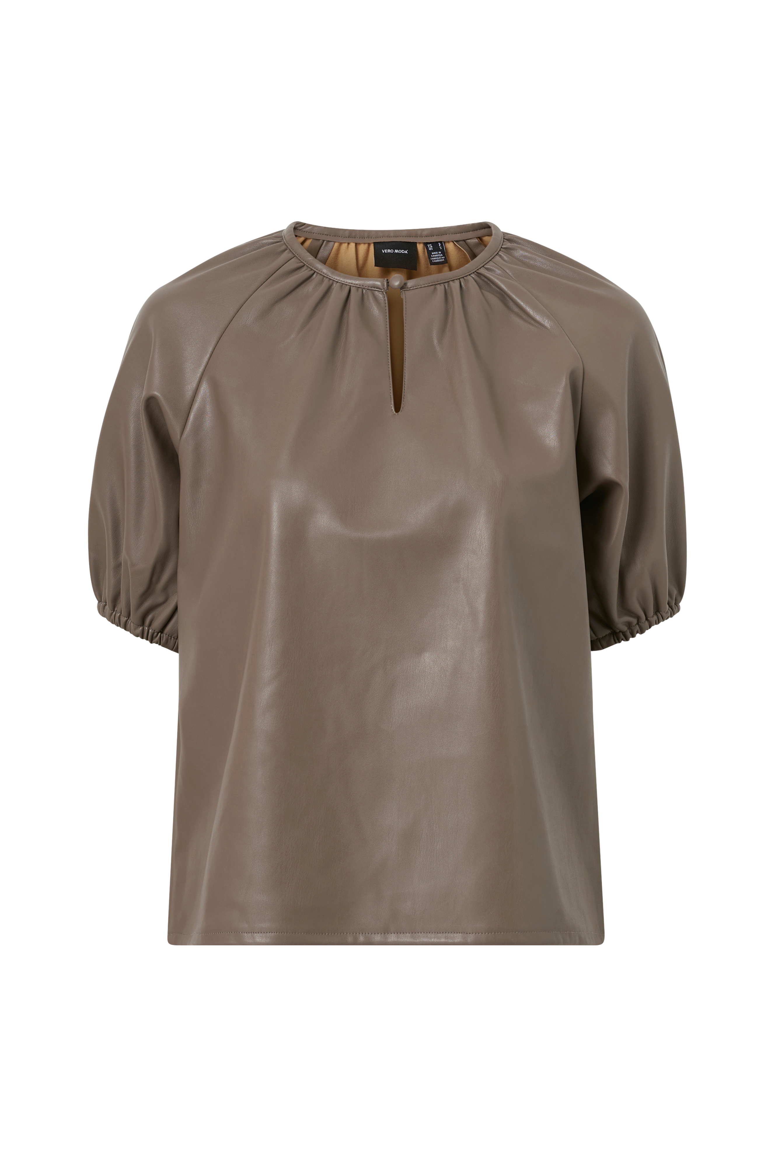 Bluse i skinnimitasjon med myk innside og lett stretch. Utsvingt modell med rund hals med splitt og kledd knapp foran. Korte raglanermer med elastiske ermekanter.