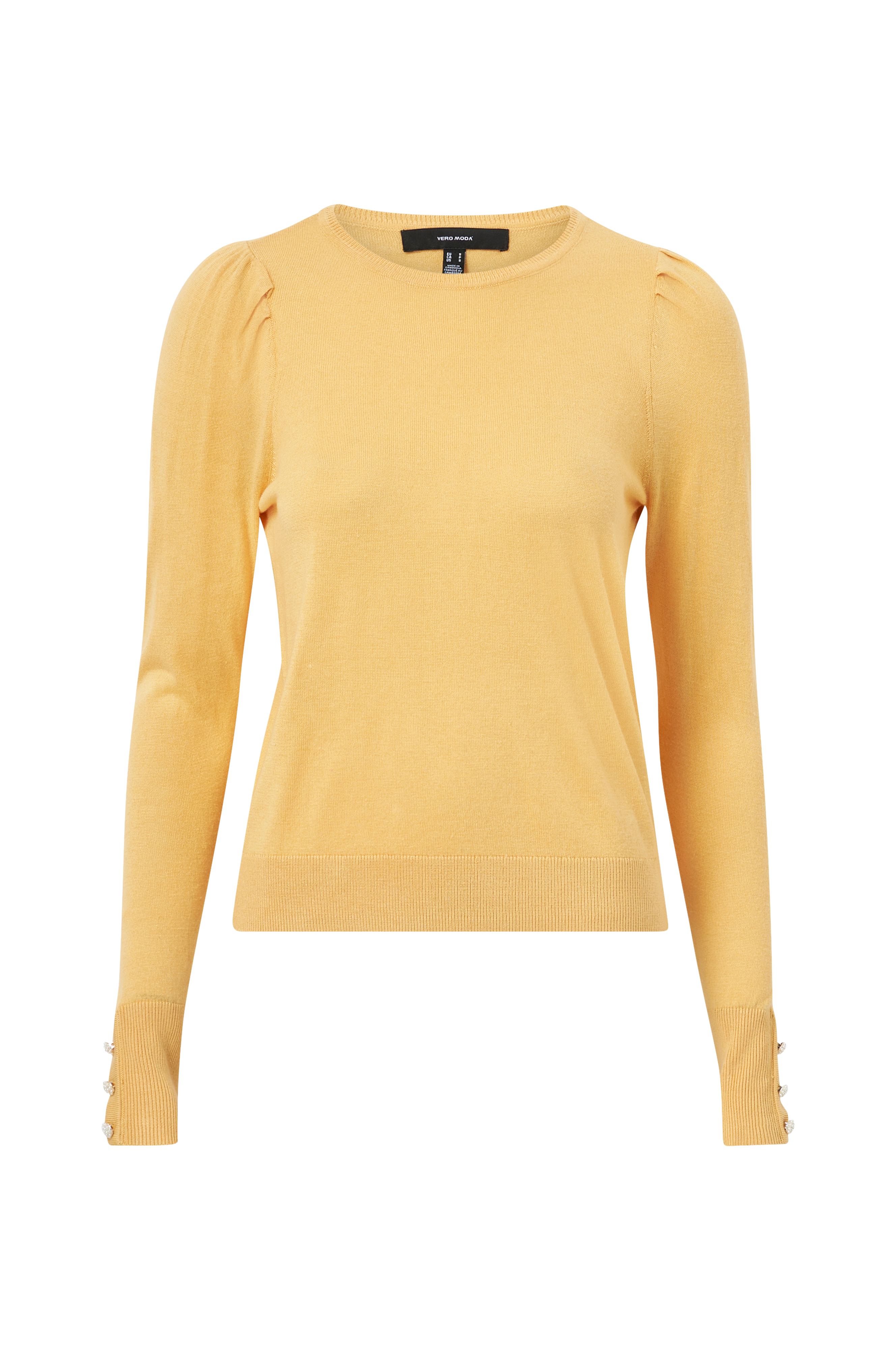 Tynn, finstrikket genser med lagte legg på skuldrene som gir fin fasong, og dekorative perleknapper i ermekantene. Smal ribb i halsringningen og bred ribb nederst.