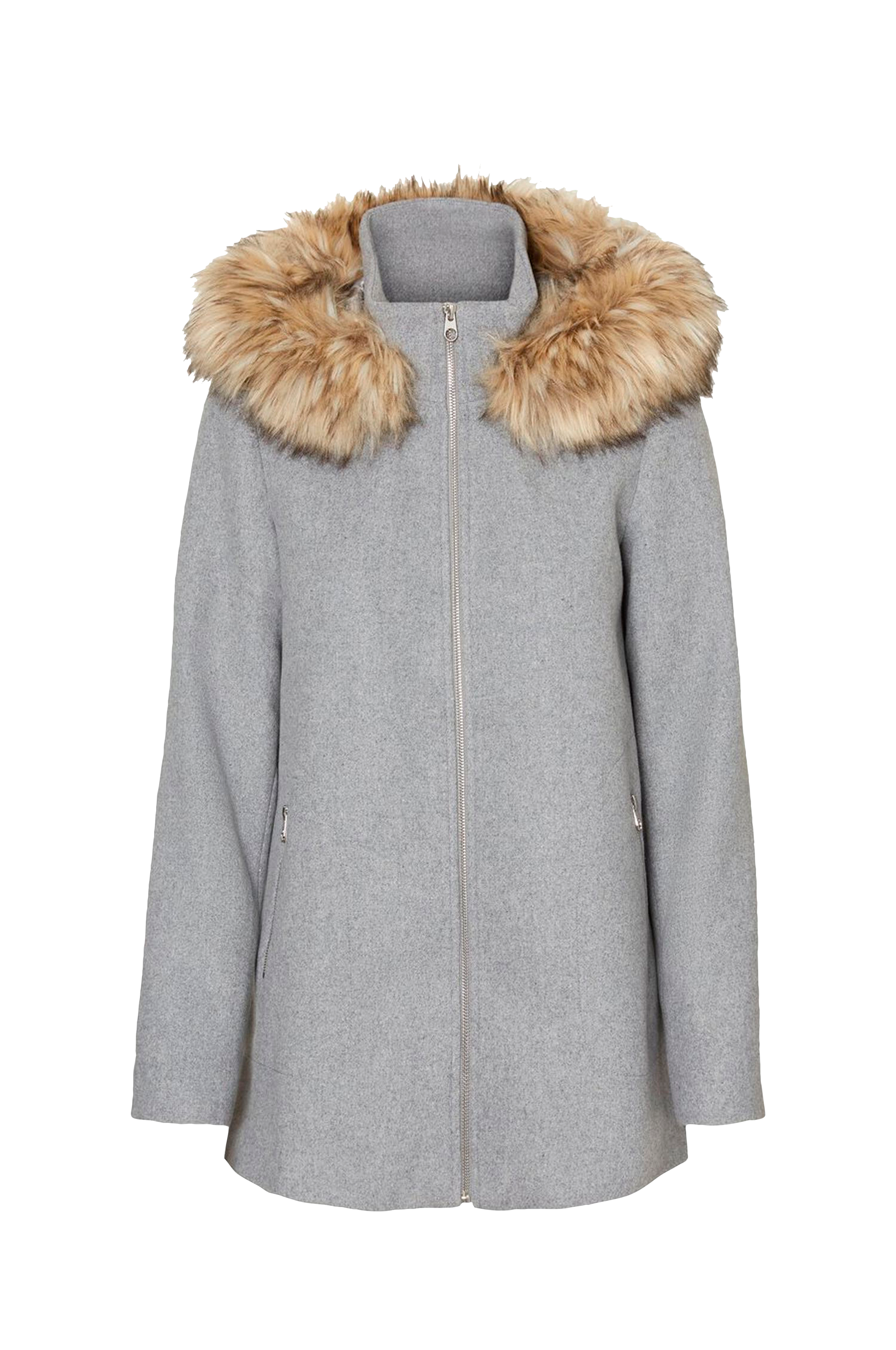 Jakke vmCollaryork Collar Wool Jacket fra Vero Moda i utsvingt modell med glidelås og to lommer med glidelås foran. Fast hette med avtagbar fuskepelskant. Produsert i en blanding av polyester og gjenvunnet ull. Lengde ca. 70 cm i str S.