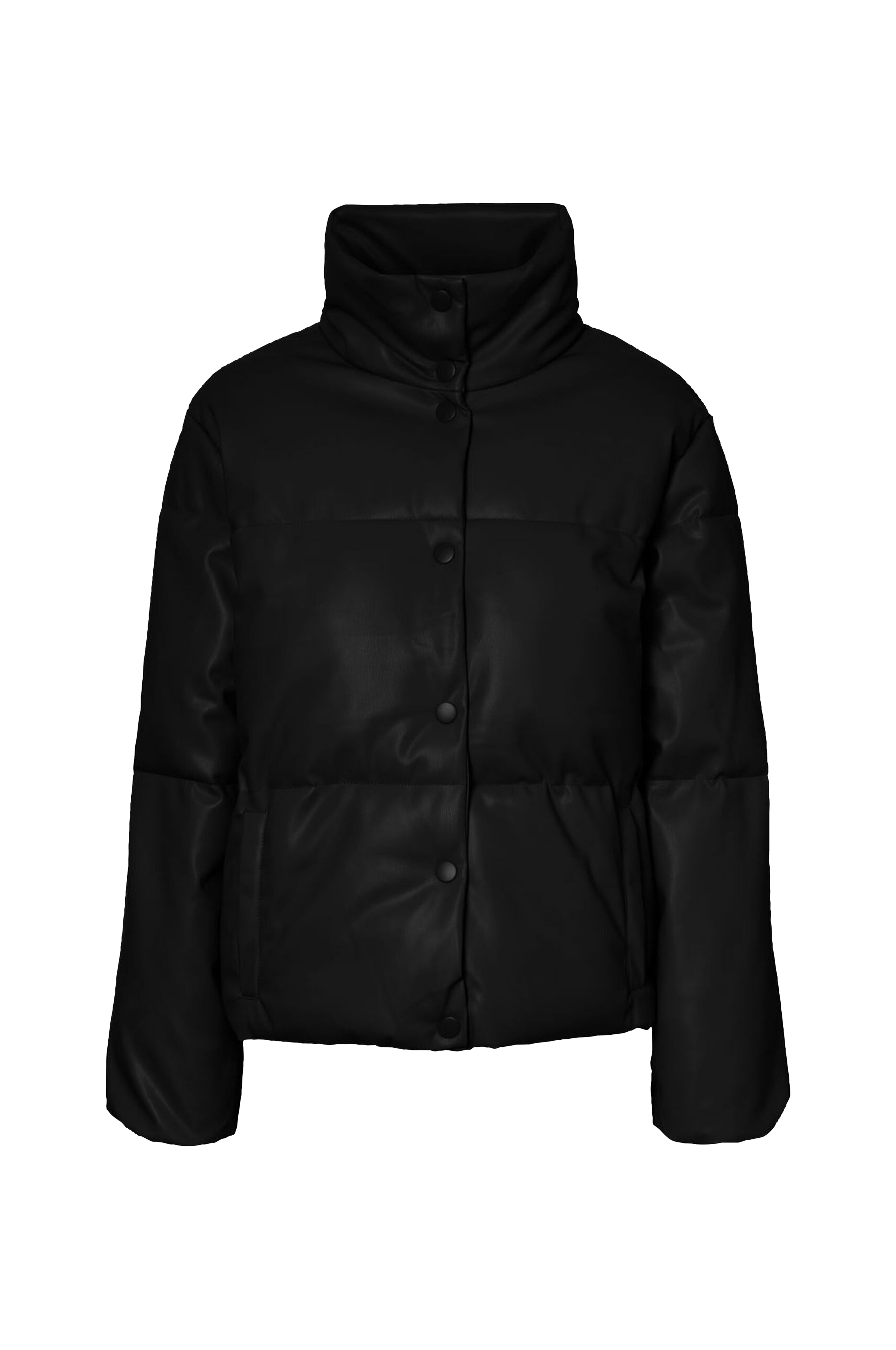 Jakke vmEmily Short Coated Jacket fra Vero Moda i kort, vattert modell med ytterstoff i skinnimitasjon. Trykknapper og lommer foran, ståkrage og skjult elastikk i ermekantene. Lengde ca. 56 cm i str S.