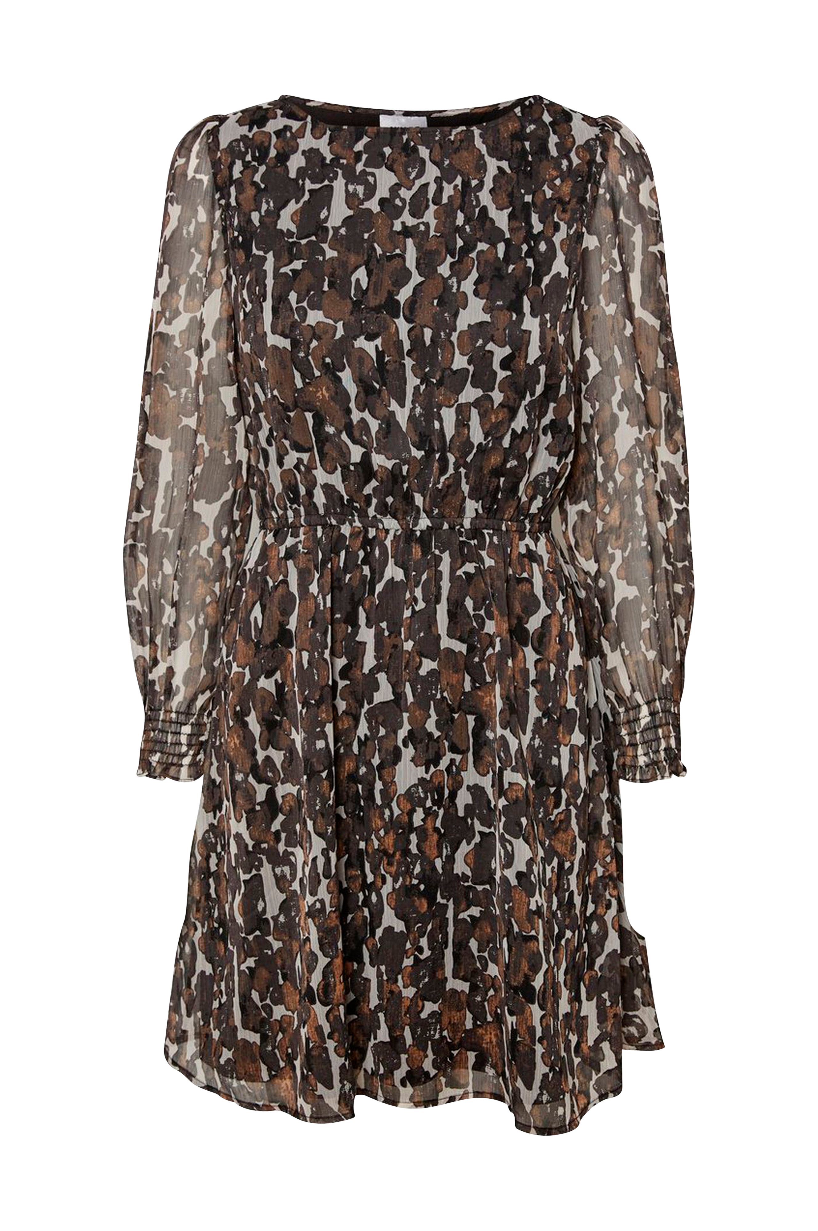 Kjole vmAlly LS Boatneck Short Dress fra Vero Moda med elastisk midje, utsvingt skjørt og lange ermer med rynket skuldersøm og vaffelstrikk i ermekanten. Framstilt i vevd chiffon. Fôret. Lengde ca. 90 cm i str. S.