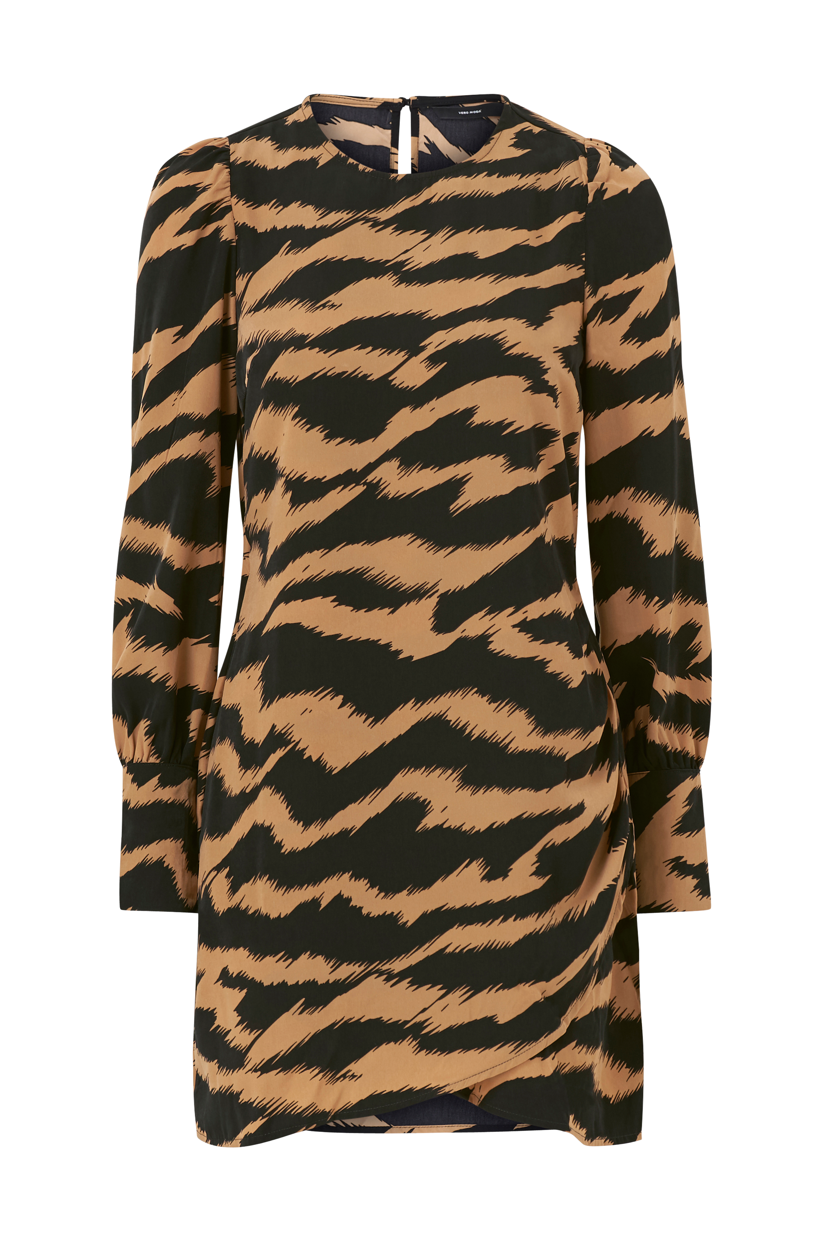 Kjole vmJunse LS Short Dress Wvn fra Vero Moda i kort, rett modell med omslagslag foran og lagte legg nederst i den ene siden. Lange ermer med puff på skuldrene og bred mansjett med knapper i ermekantene. Splitt og knapp i nakken og strikk bak i midjen. Fremstilt i vevd kvalitet. Lengde ca. 86 cm i str. S.