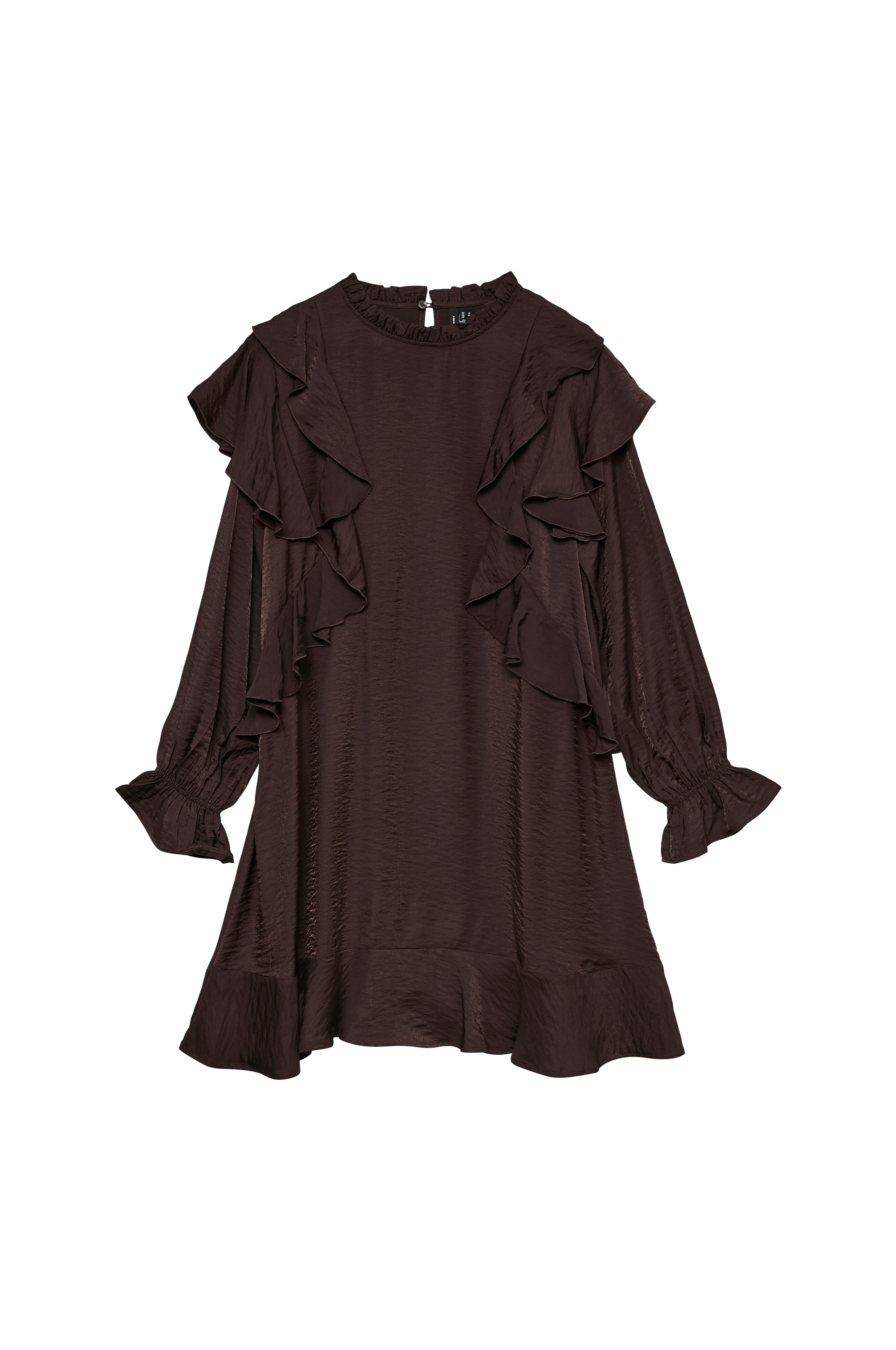 • Kort, lett skinnende kjole• Rund hals med volangkant• Skjær med knapp i nakken• Dekorative volanger på toppen• Ballongermer med gummistrikk med en volang i ermeslutten• Bred volang i nedre kant• Lengde: 91 cm i størrelse S