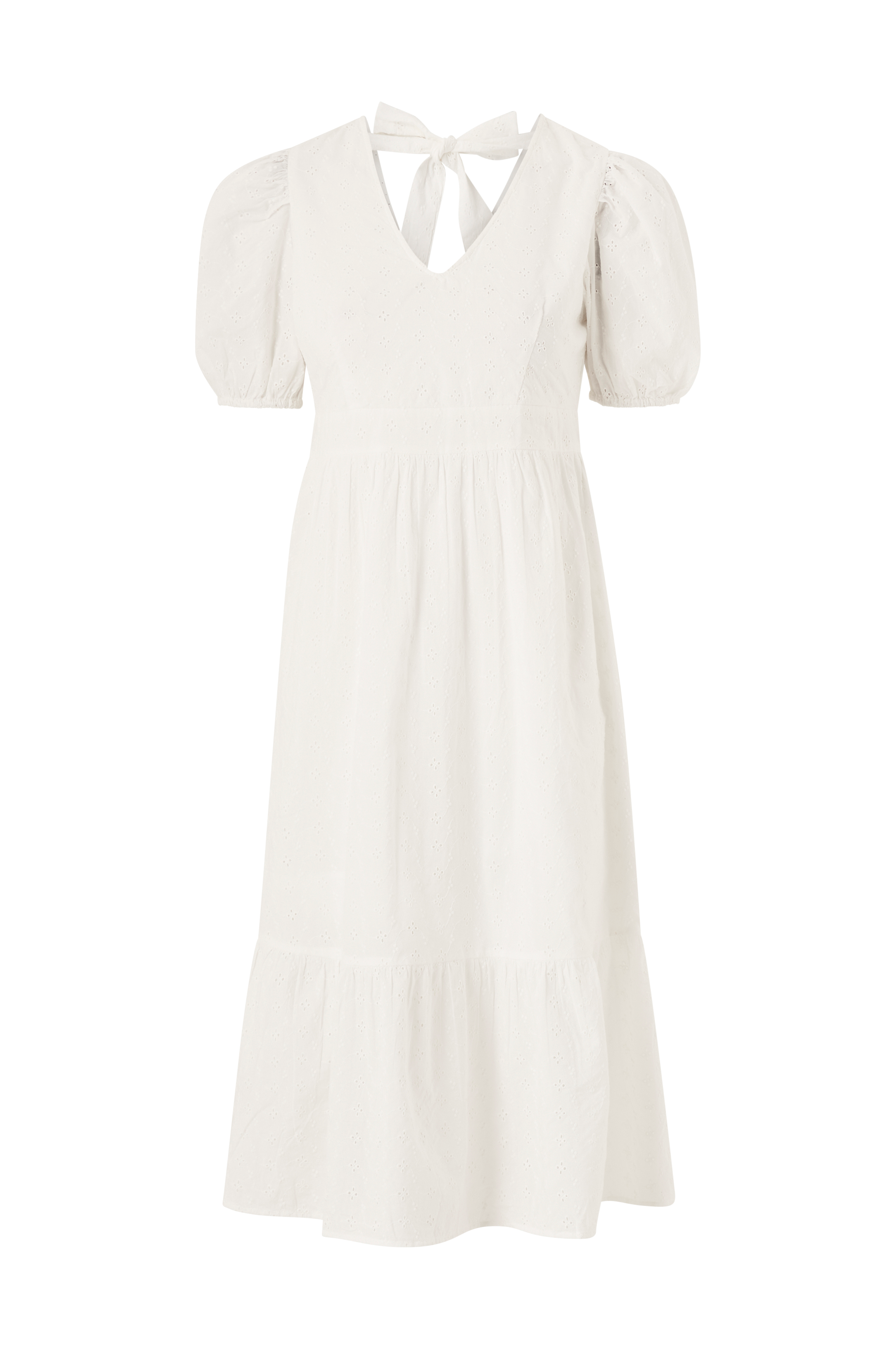 • Kjole i bomull med hullbroderi rundt• Korte bobleermer med gummistrikk i ermeslutten• V-formet hals med dekorative knytbare tråder bakpå• Vaffelsøm i midjen bak• Volang i nedre kant• Foring i bomull• Lengde: 110 cm i størrelse S